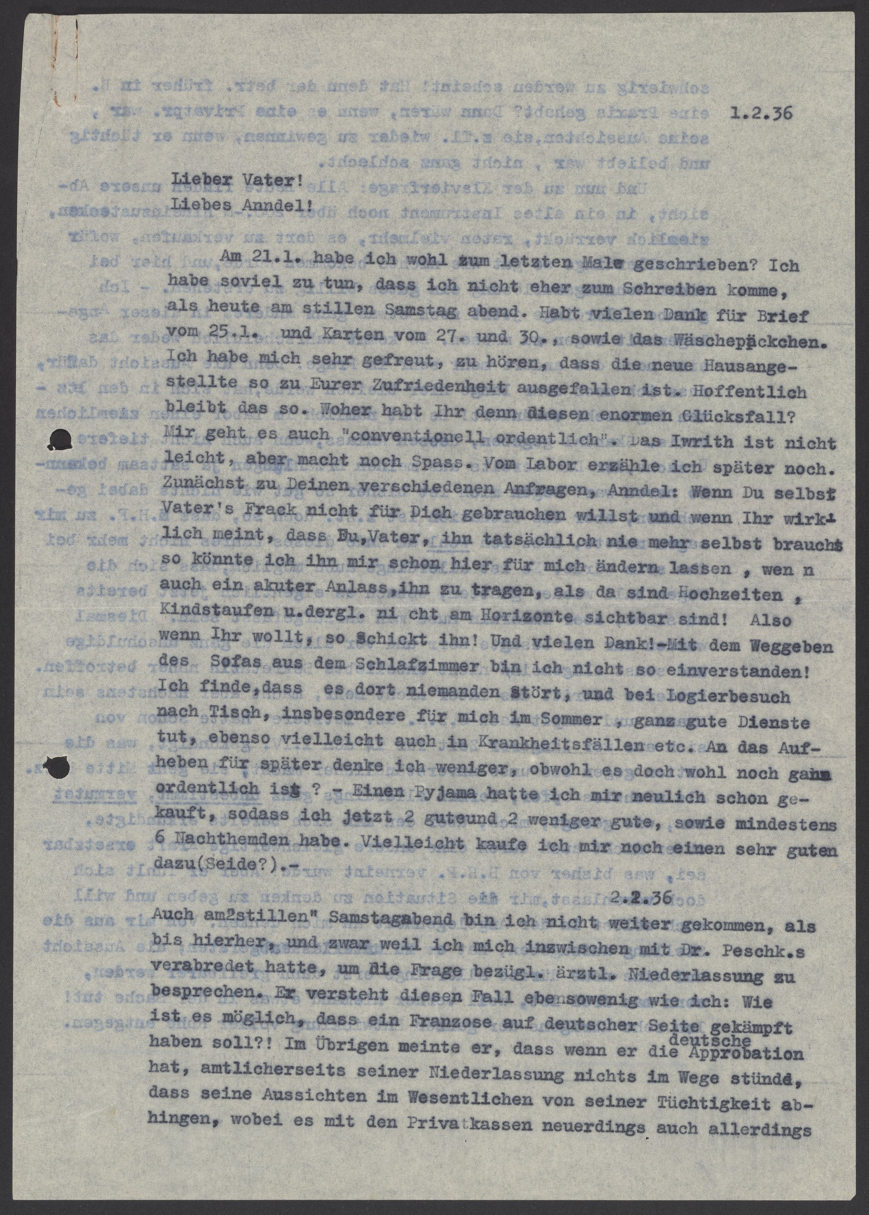 Letter from Max Bredig to Georg Bredig and Marianne Homburger, February 1, 1936