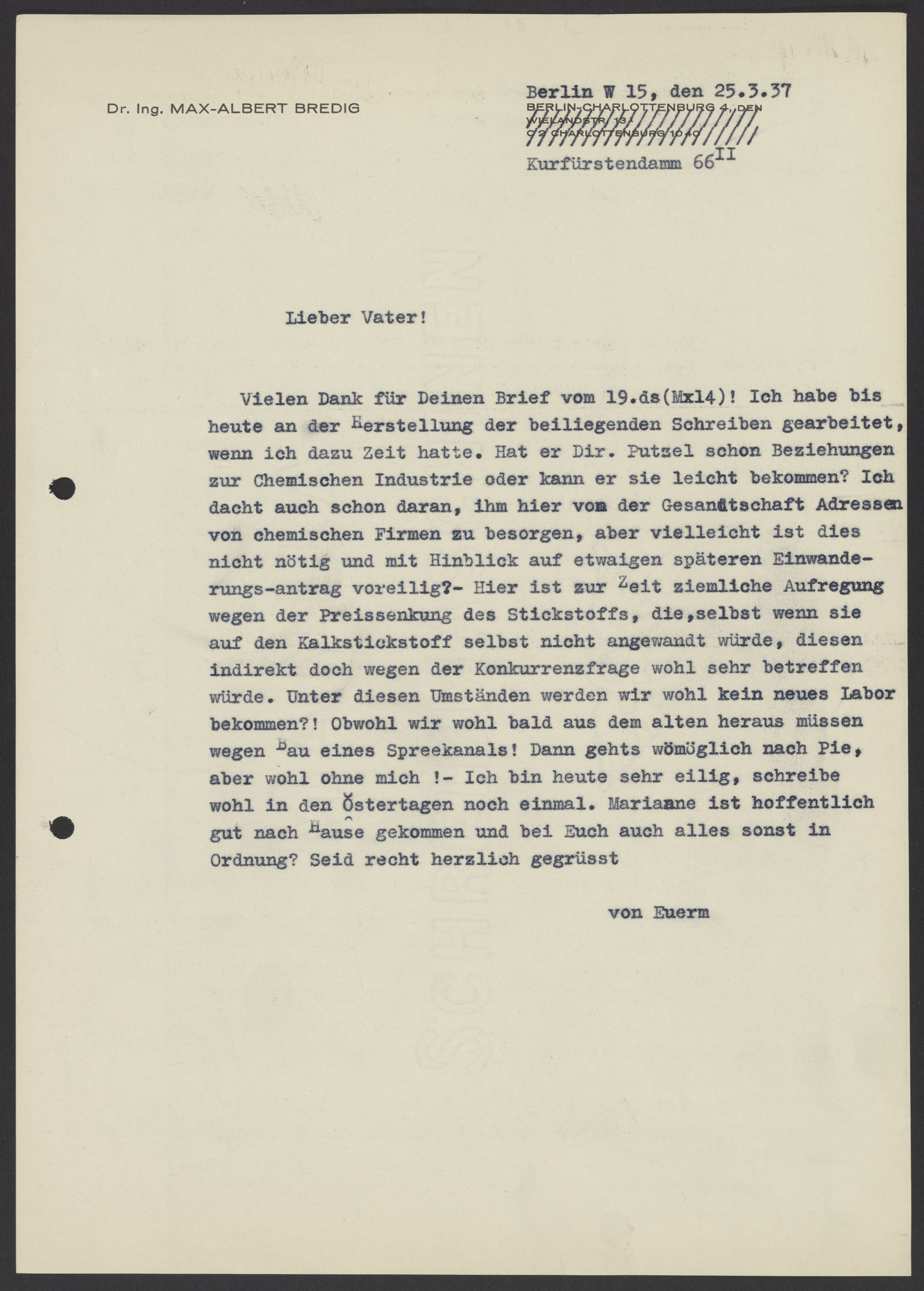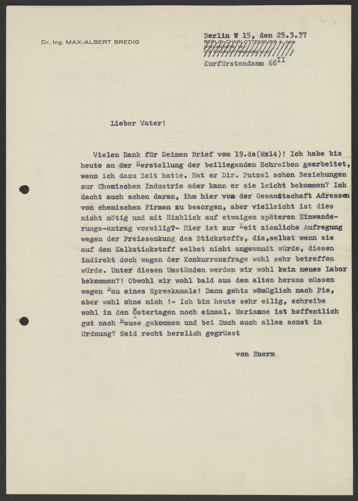 Letter from Max Bredig to Georg Bredig, March 25, 1937