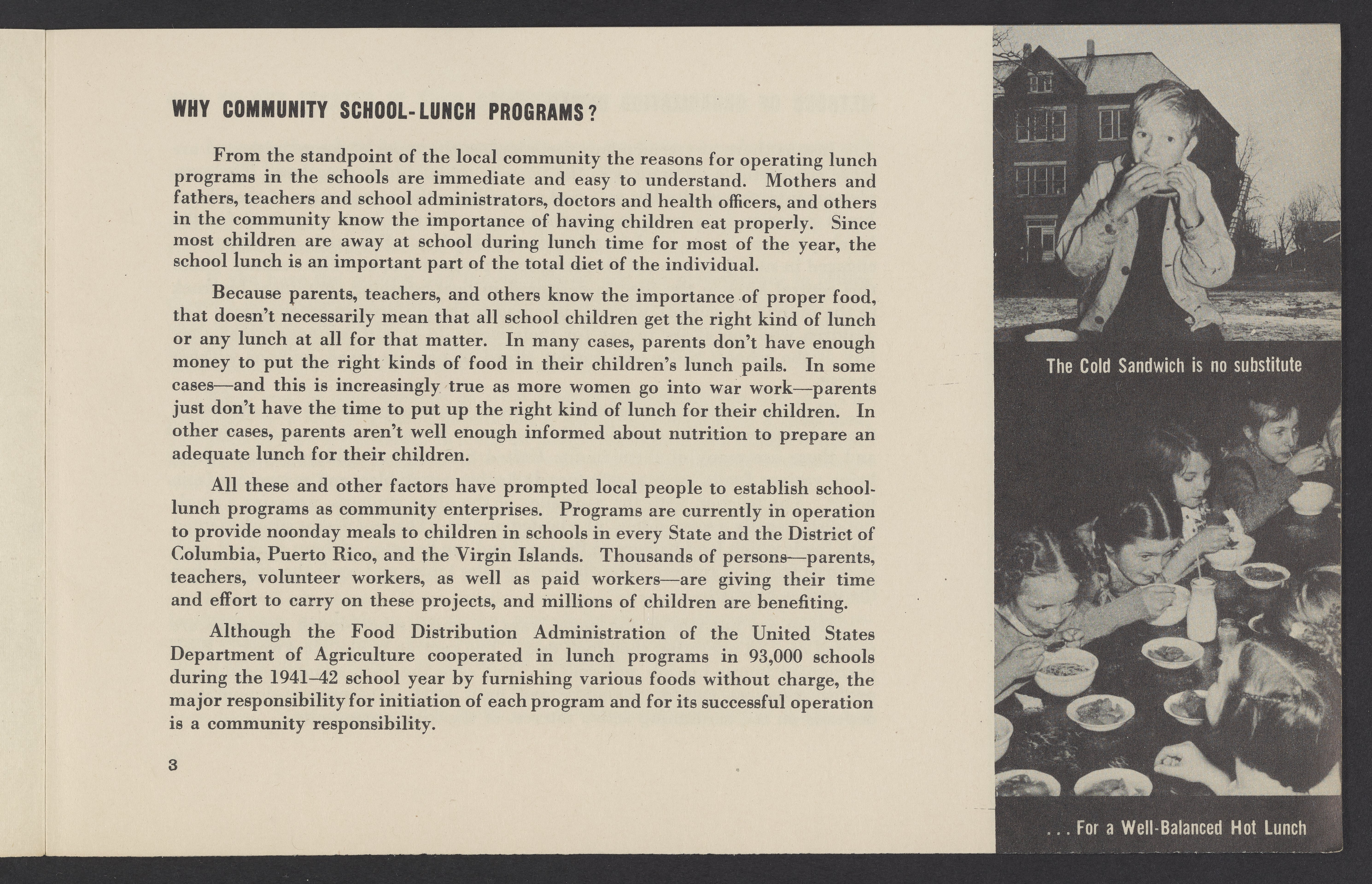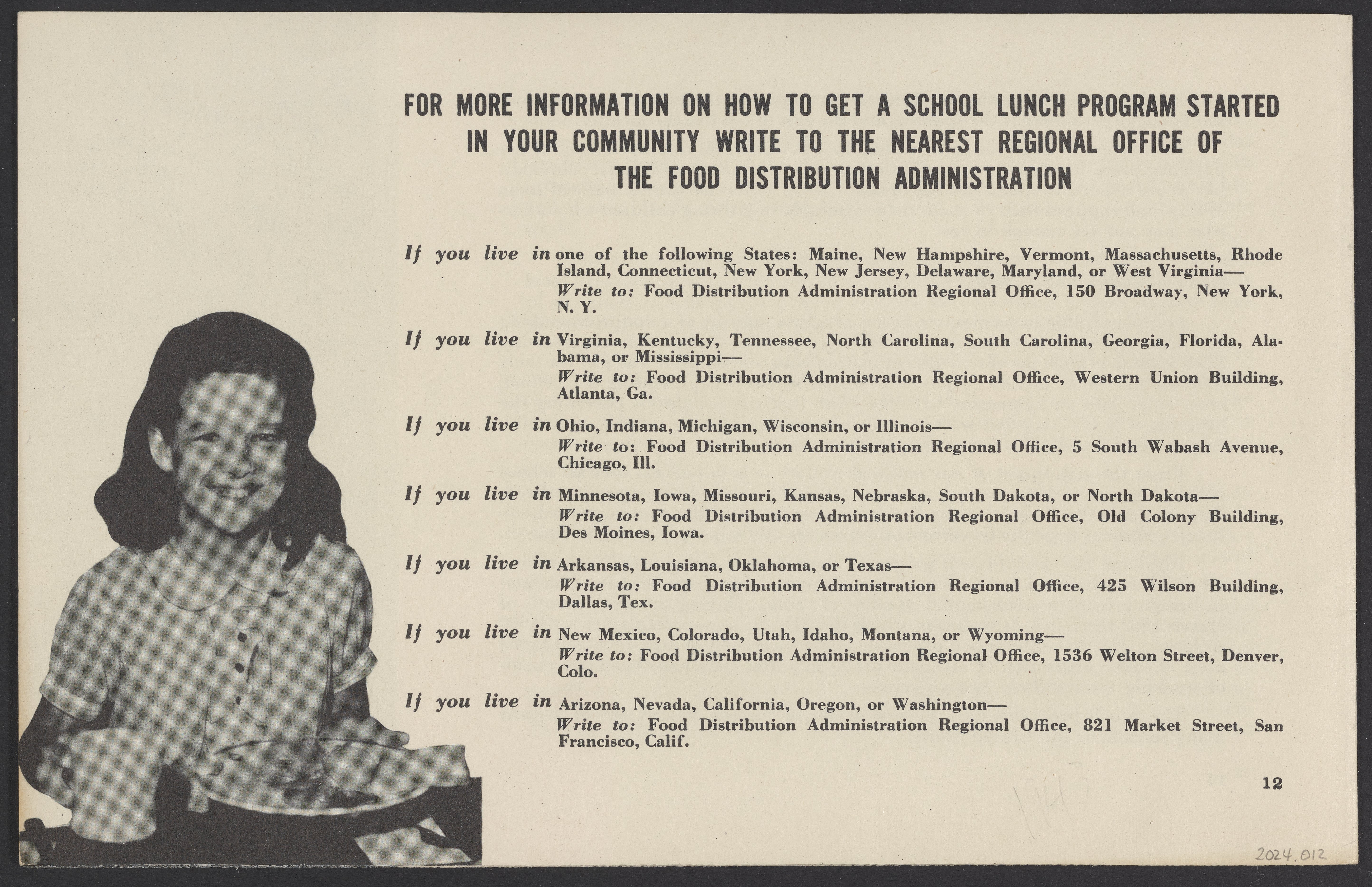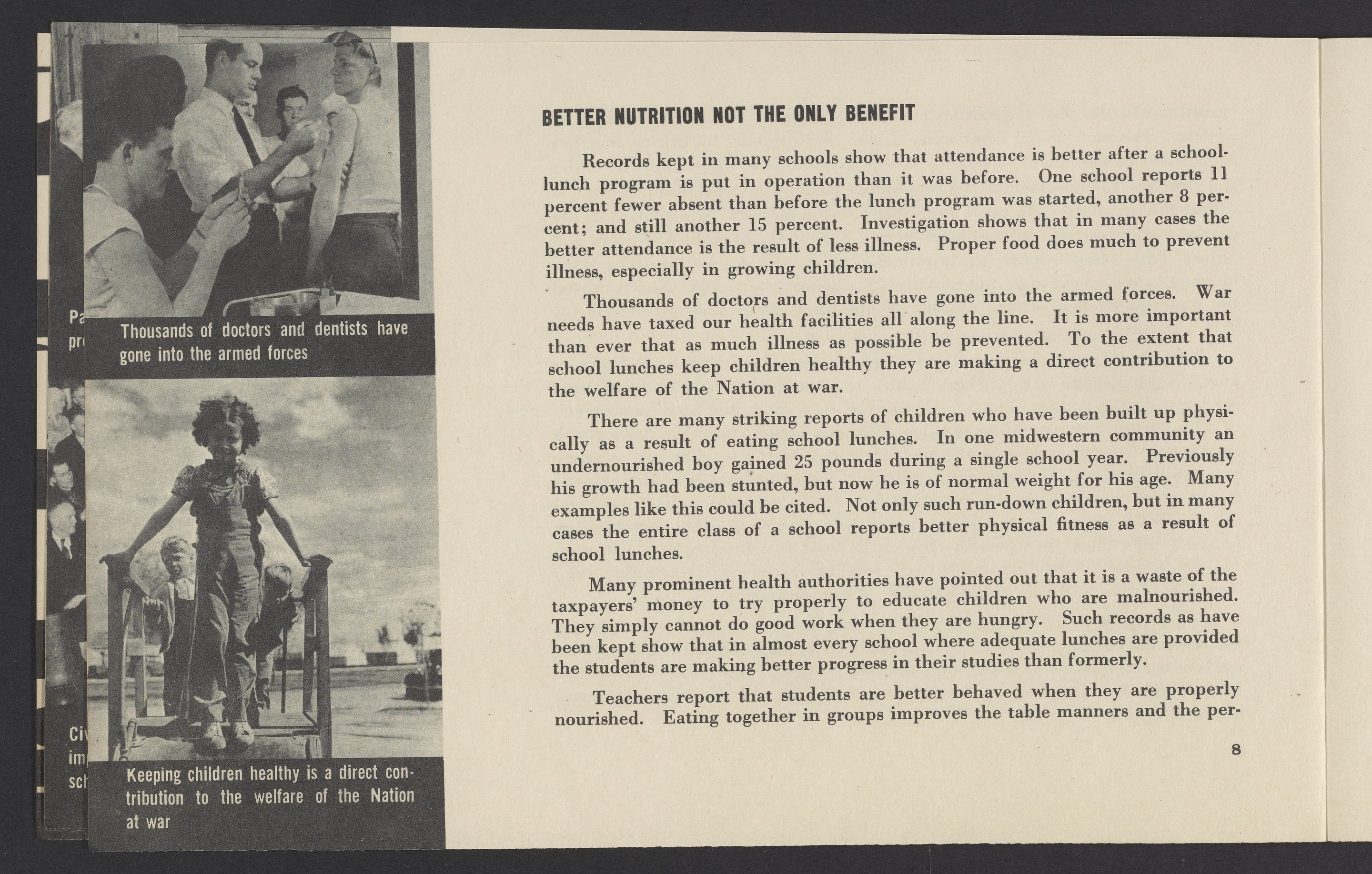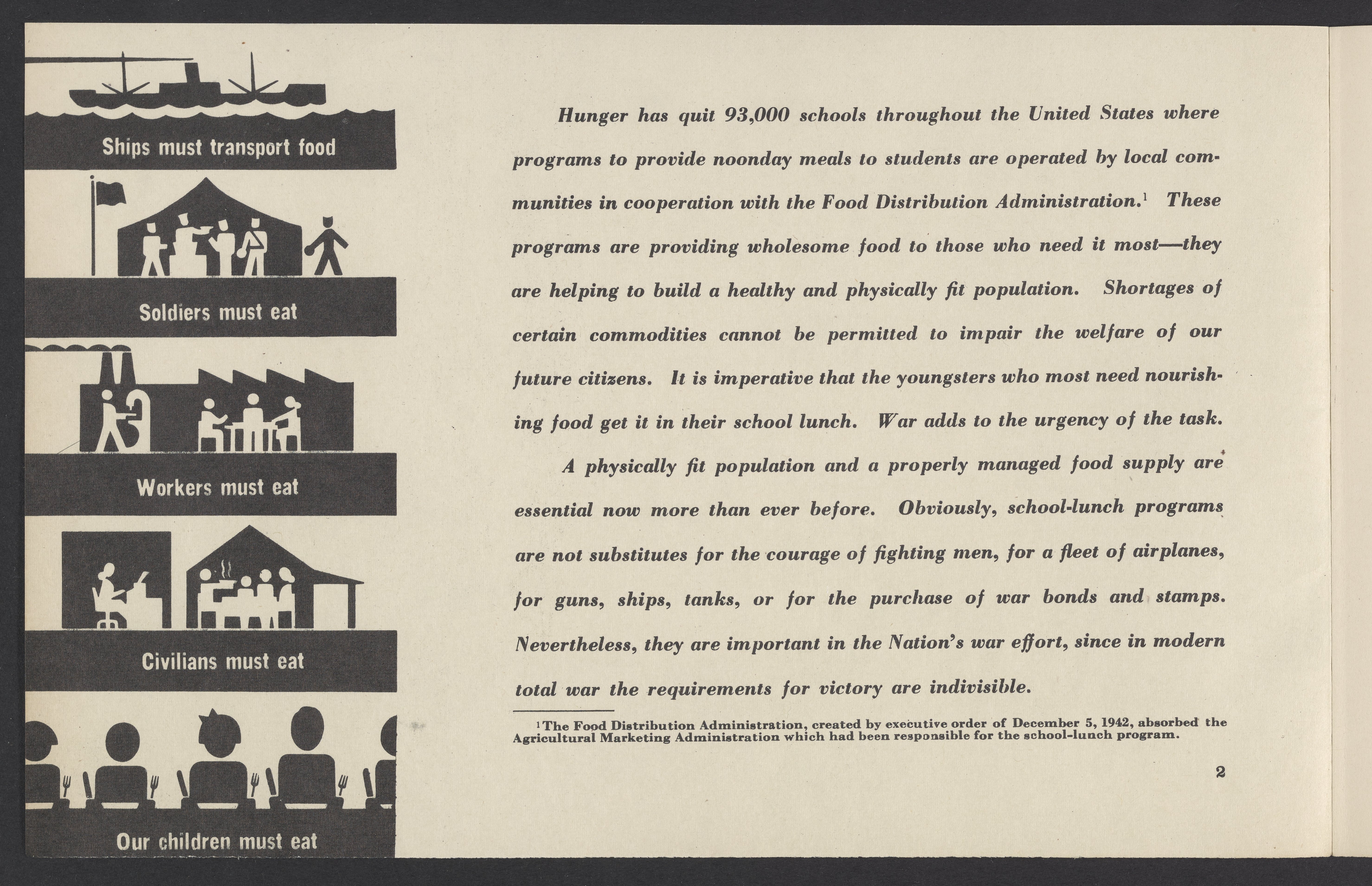 Small JPG1200 x 776px — 167 KBLarge JPG2880 x 1863px — 1.2 MBFull-sized JPG5778 x 3738px — 5.5 MBOriginal fileTIFF — 5778 x 3738px — 61.8 MBHunger Quits School is a pamphlet published in 1943 by the United States Food Distribution Administration. This pamphlet explains the benefits of school lunch programs, and how to start them in local communities.