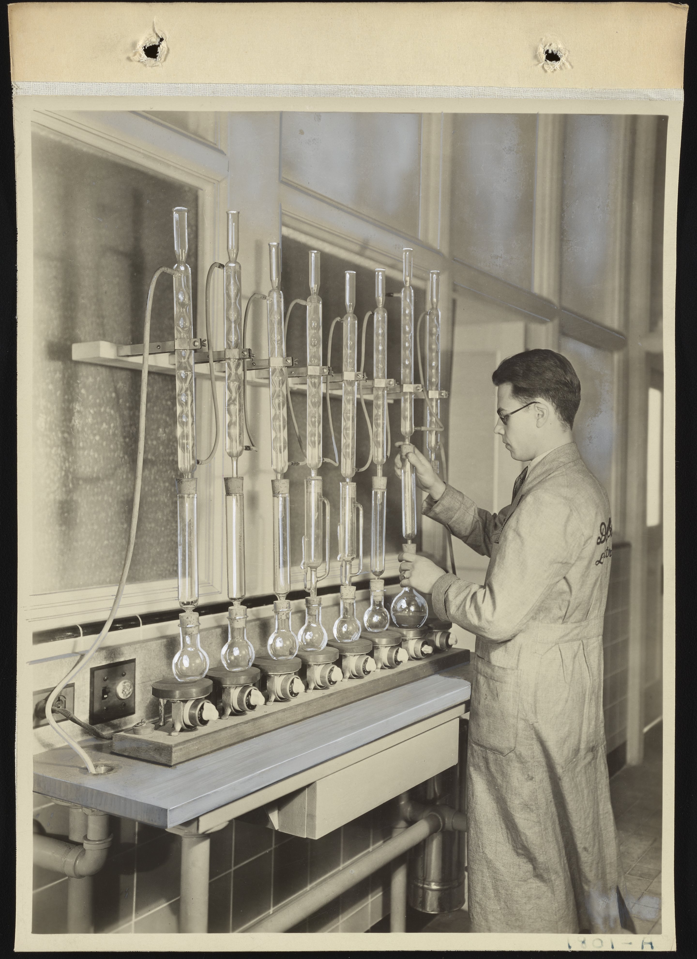 Dearborn Chemical Company. “A. Sherwood Using Extraction Rack at Dearborn Laboratory Facility,” circa 1924. BetzDearborn, Incorporated Records, Box 17, Folder 13. Science History Institute. Philadelphia. https://digital.sciencehistory.org/works/x920fx81s.
