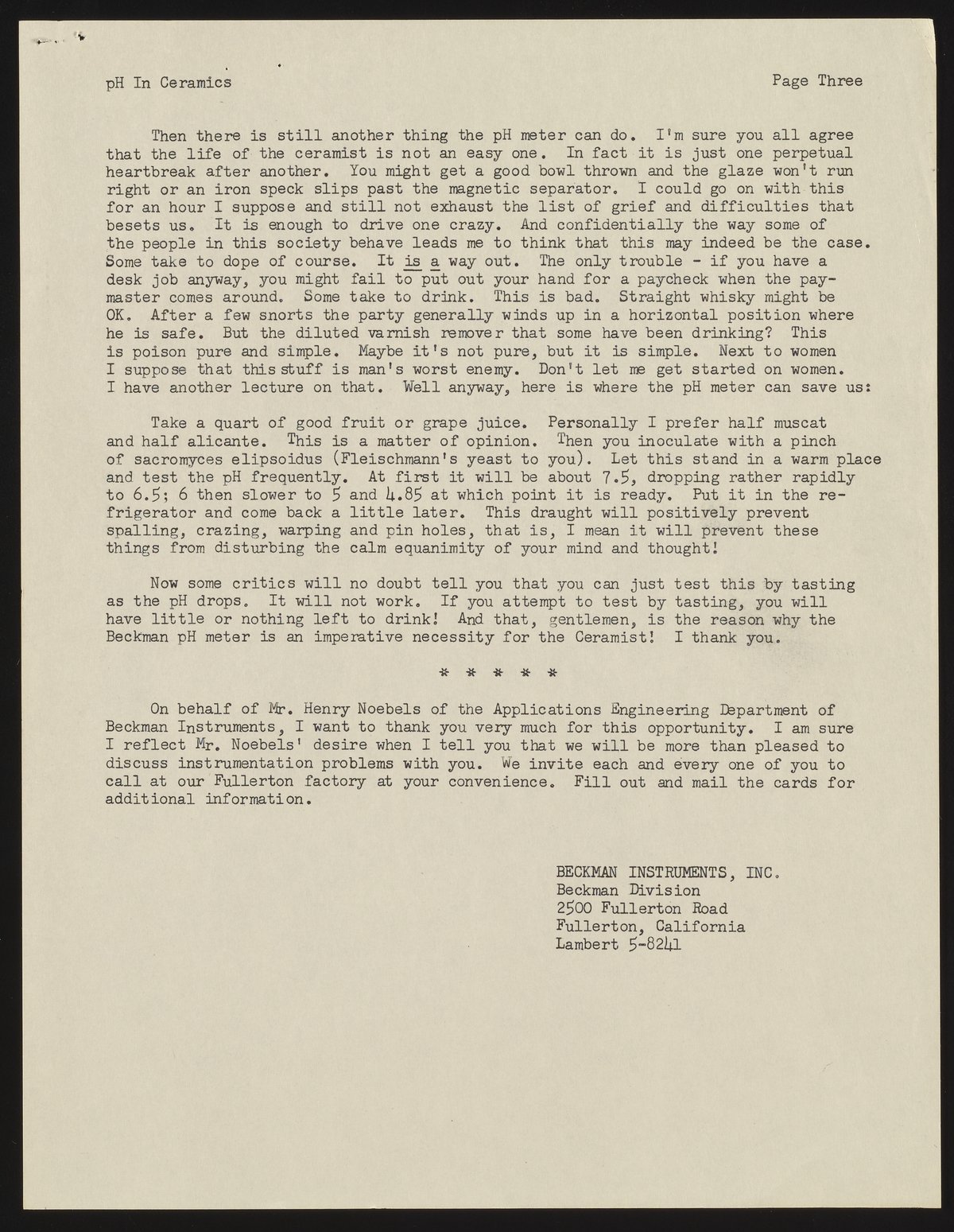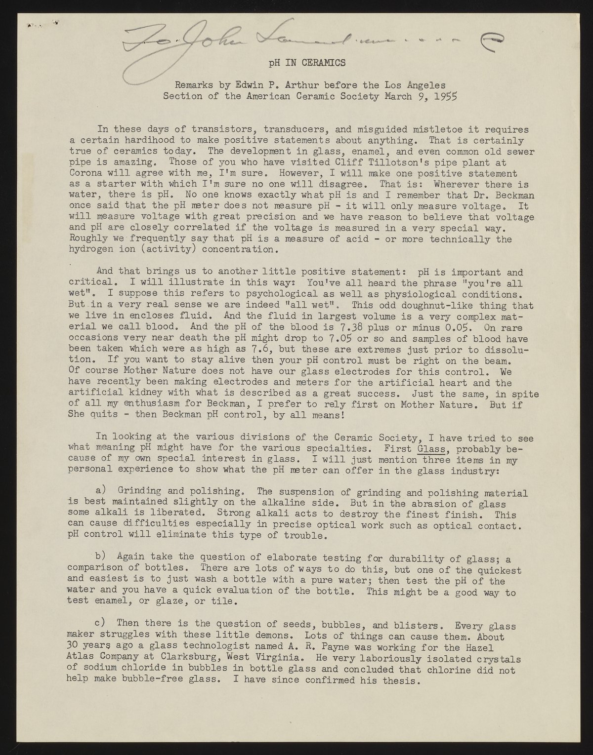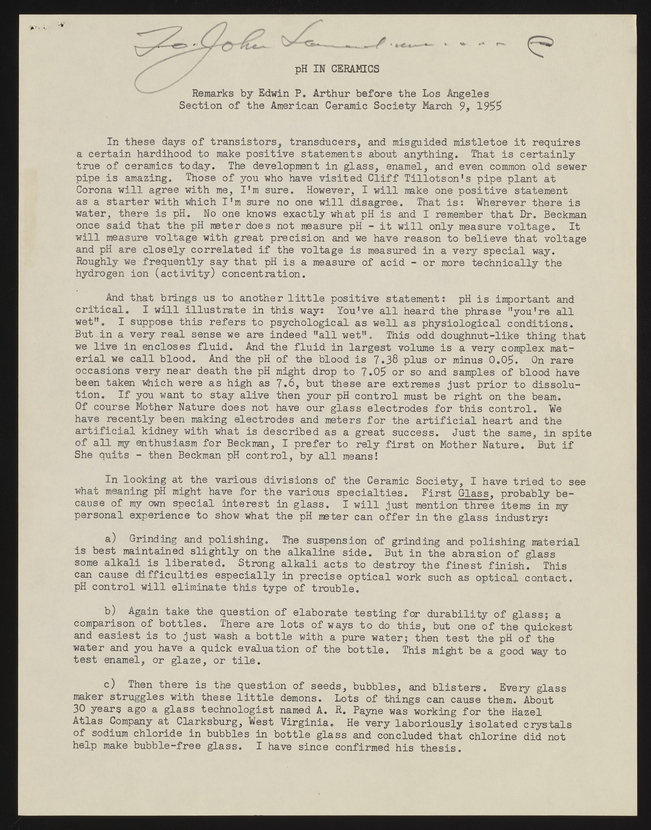 Small JPG1200 x 1529px — 385 KBFull-sized JPG2725 x 3473px — 1.3 MBOriginal fileTIFF — 2725 x 3473px — 27.1 MBIn his address to the American Ceramic Society, Edwin Arthur discussed the importance of pH--and, by extension, the measurement of pH with Beckman instruments--in the work of ceramists.