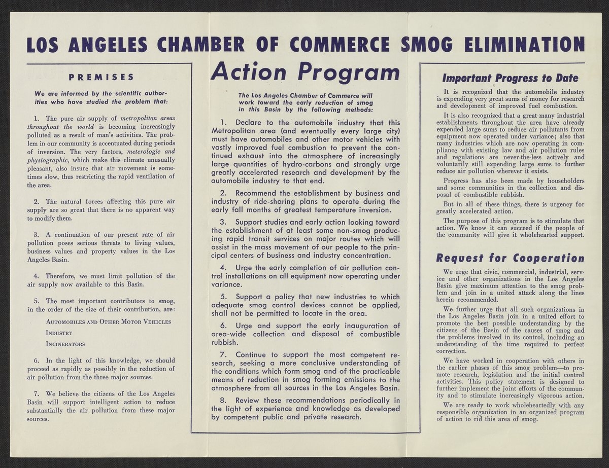 This trifold brochure lays out the scientific findings about the problem of smog in Los Angeles, as well as a plan for action, progress to date, and a request for cooperation.