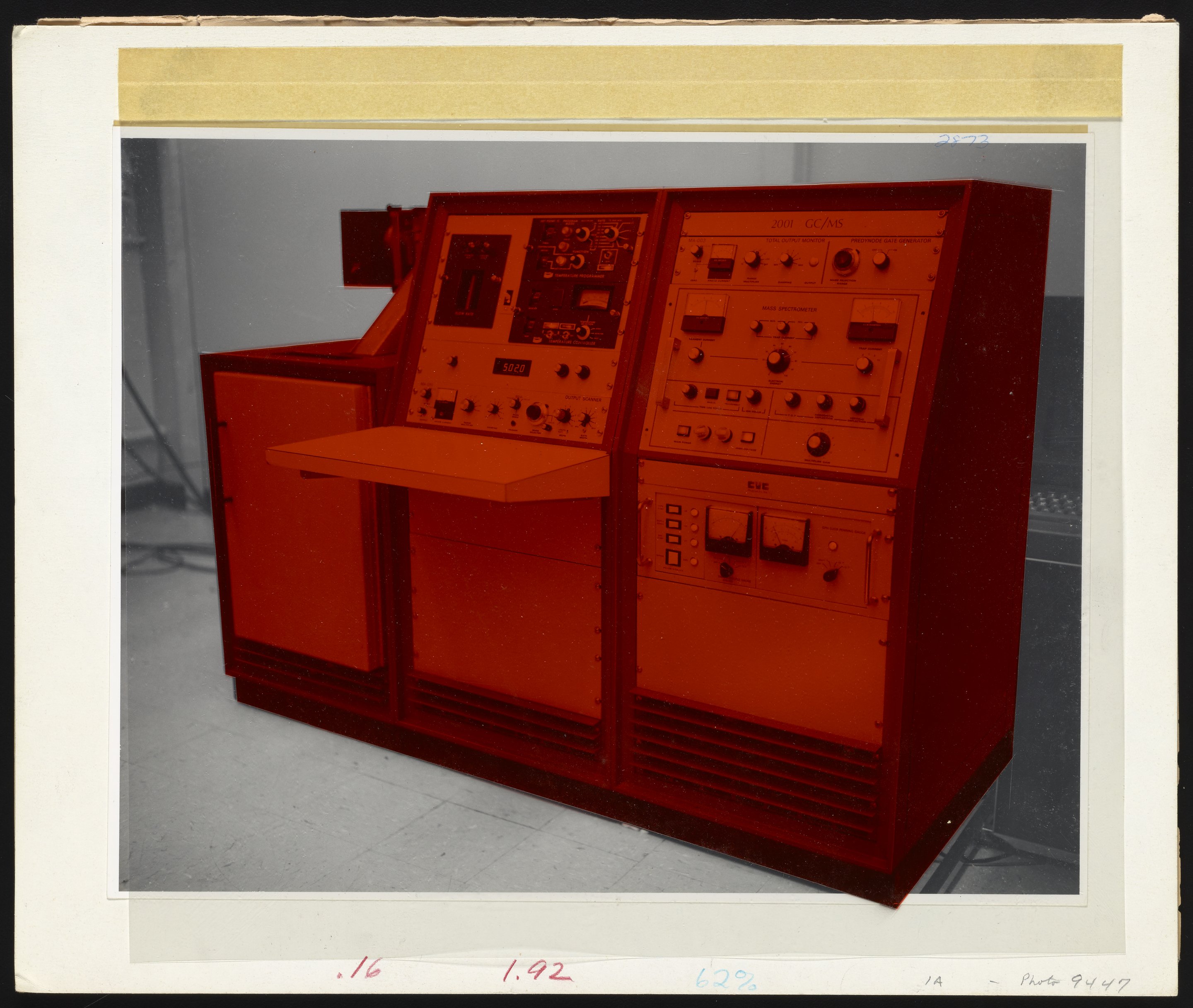 Silhouetted printer's proof depicting a Consolidated Vacuum Corporation Model 2001 Masschromatograph, with view of assorted control panels including an output scanner, predynode gate generator, and temperature controller. Also known as CVC Products Inc., Consolidated Vacuum Corporation operated as a subsidiary of the Bendix Corporation prior to Allied Signal's takeover of Bendix in 1983. The Masschromatograph 2001 offered the qualitative and quantitative capabilities of combined gas chromatography and mass spectrometry for a variety of laboratory applications, including forensics, toxicology, and food flavoring.