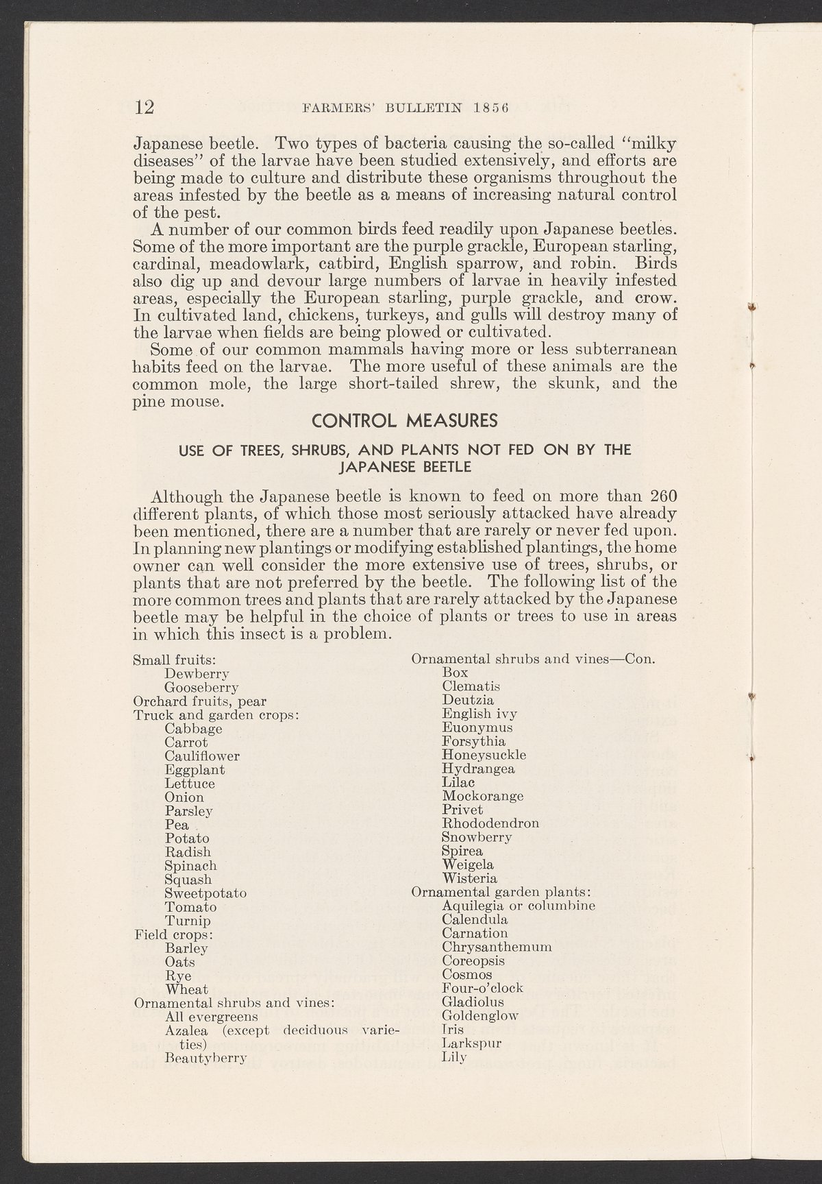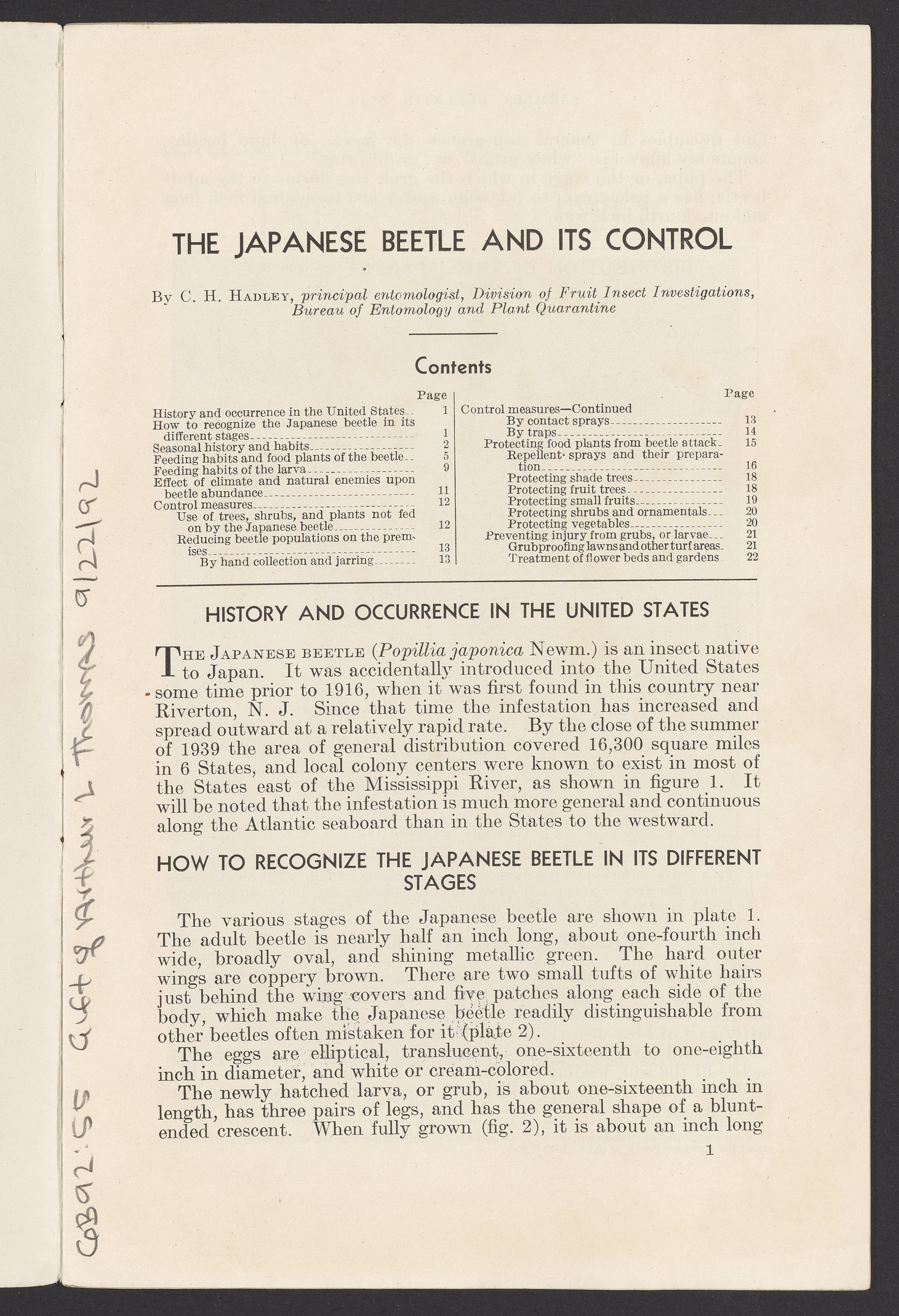 Small JPG1200 x 1843px — 544 KBFull-sized JPG2509 x 3853px — 2.3 MBOriginal fileTIFF — 2509 x 3853px — 27.7 MBJournal number 1856 in the Farmers' Bulletin series published by the United States Department of Agriculture. The article describes the Japanese beetle, a pest brought to the United States from Japan, including its seasonal history, harmful habits, and the methods found useful in destroying the insect or preventing injury to crops and plants. The work includes both black and white and color illustrations. This issue was contributed to by the United States Bureau of Entomology and Plant Quarantine.