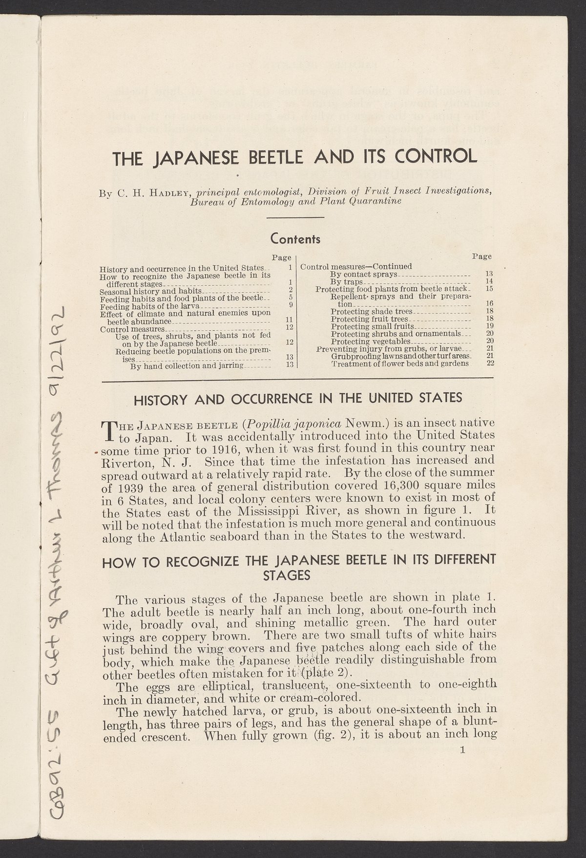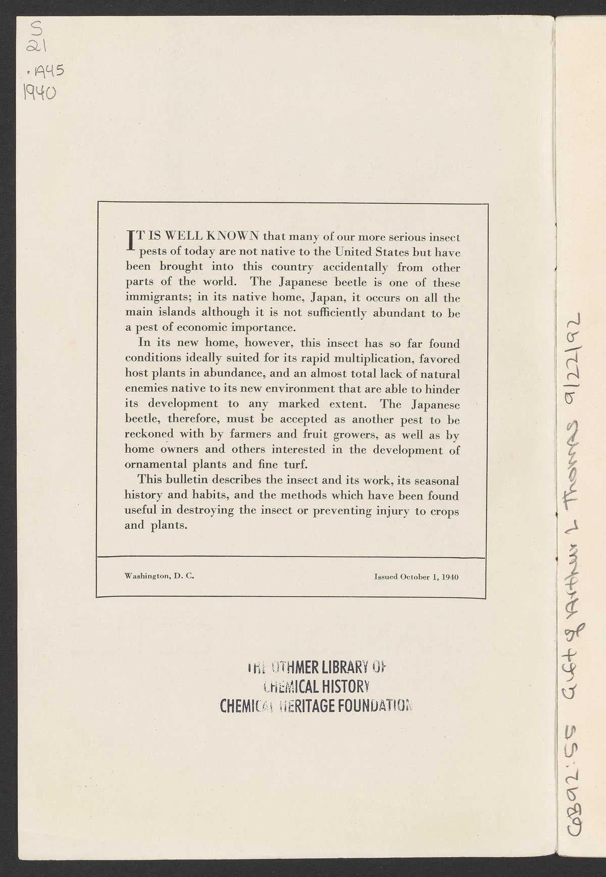 Hadley, C. H. “The Japanese Beetle and Its Control.” Washington (D.C.): United States. Department of Agriculture, 1940. S21 .A45 1940. Science History Institute. Philadelphia. https://digital.sciencehistory.org/works/xdtke7a.