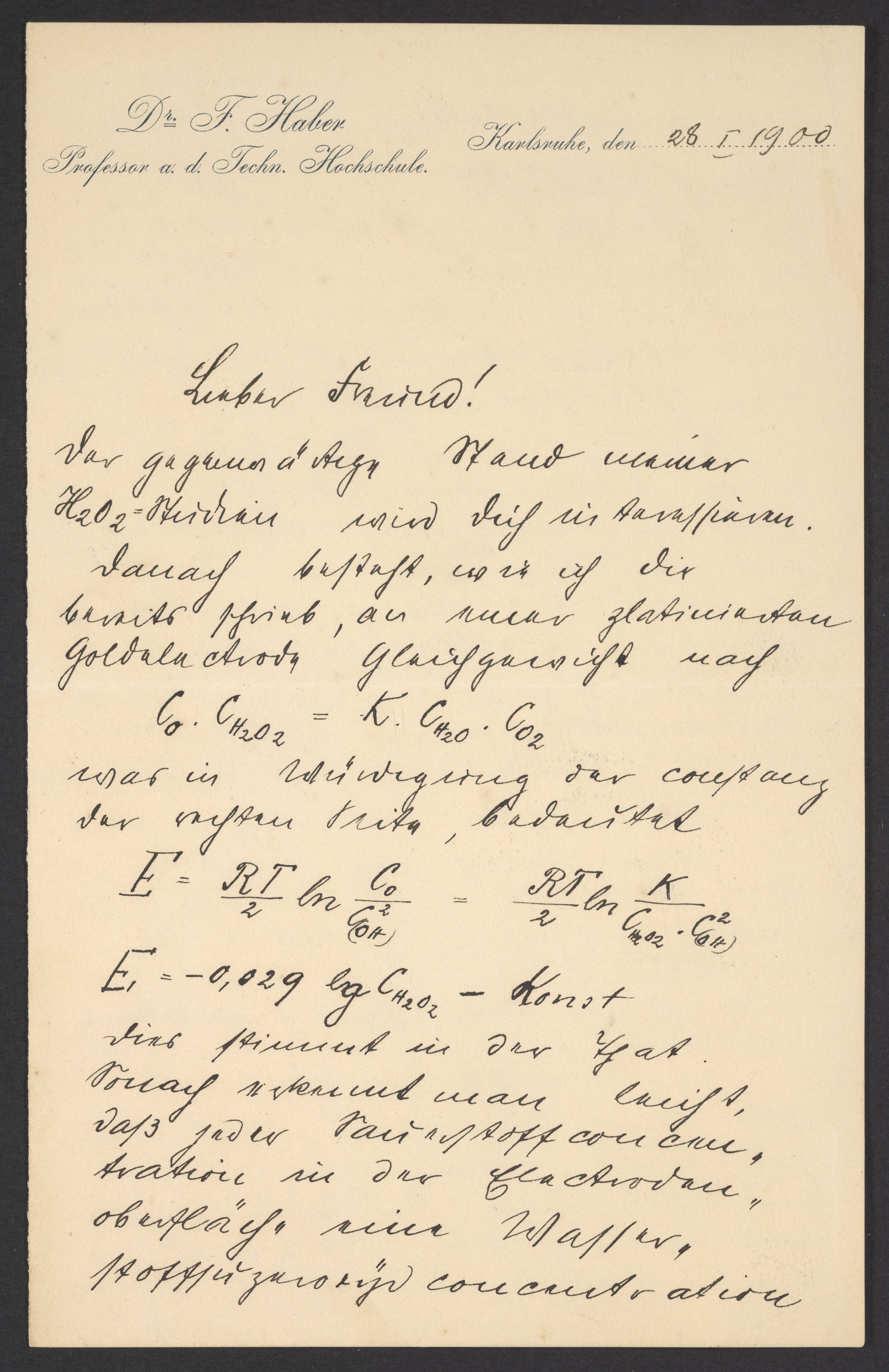 Haber, Fritz. “Letter from Fritz Haber to Georg Bredig, January 1900,” January 28, 1900. Papers of Georg and Max Bredig, Box 1, Folder 49. Science History Institute. Philadelphia. https://digital.sciencehistory.org/works/xemlg5m.