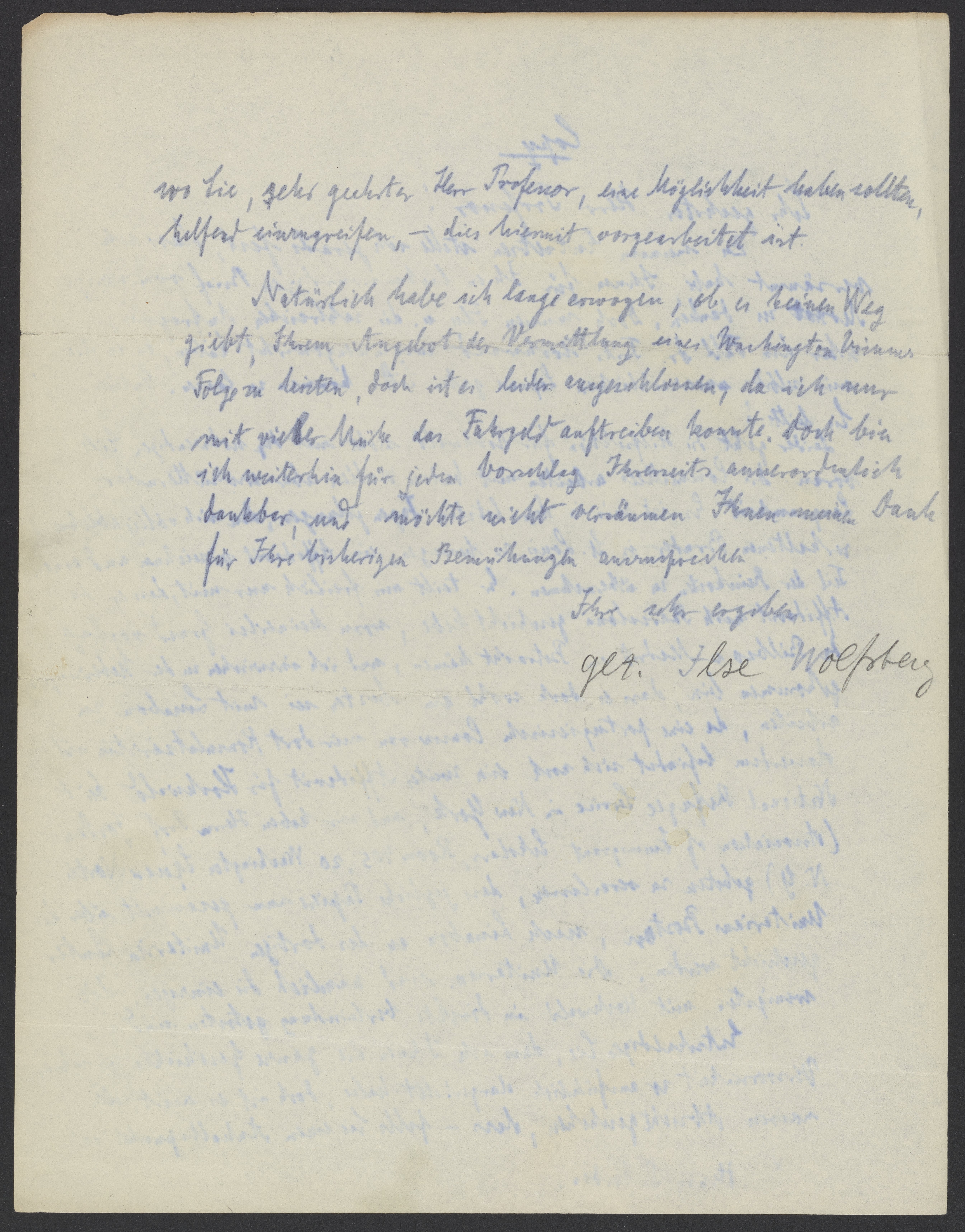Natürlich habe ich lange erwogen, ob es keinen Weg giebt, Ihrem Angebot der Vermittlung eines Washington Visums Folge zu leisten, doch ist es leider ausgeschlossen, da ich nur mit vieler Mühe das Fahrgeld auftreiben konnte. Doch bin ich weiterhin für jeden Vorschlag Ihrerseits ausserordentlich dankbar, und möchte nicht versäumen Ihnen meinen Dank für Ihre bisherigen Bemühungen anzusprechen.