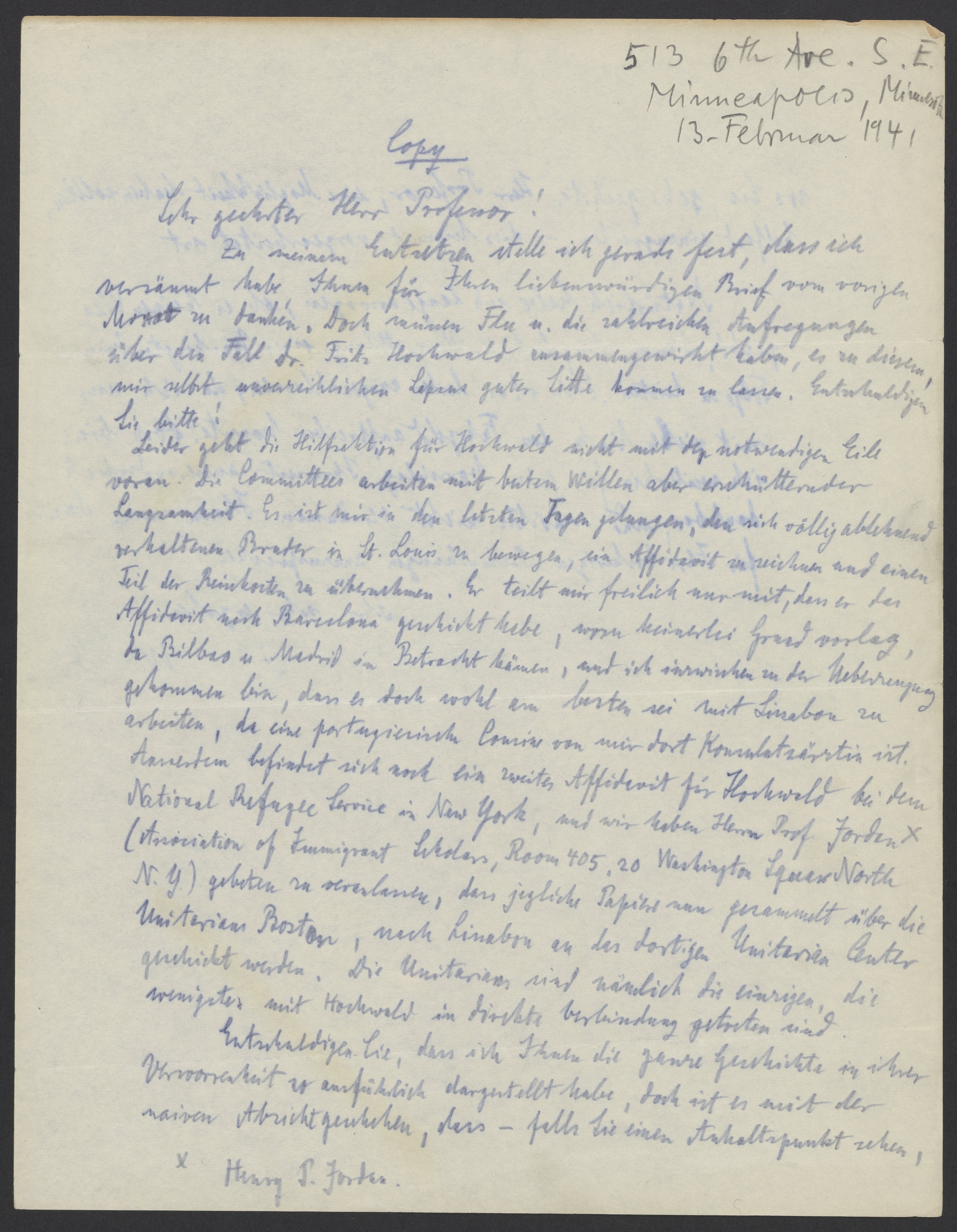 Ausserdem befindet sich noch ein zweites Affidavit für Hochwald bei dem National Refugee Service in New York, und wir haben Herrn Prof. Jordan* (Association of Immigrant Scholars, Room 405, 20 Washington Square North N.Y.) gebeten zu veranlassen, dass jegliche Papiere nun gesammelt über die Unitarians Boston, nach Lissabon an das dortige Unitarian Center geschickt werden. Die Unitarians sind nämlich die einzigen, die wenigstens mit Hochwald in direkte Verbindung getreten sind.