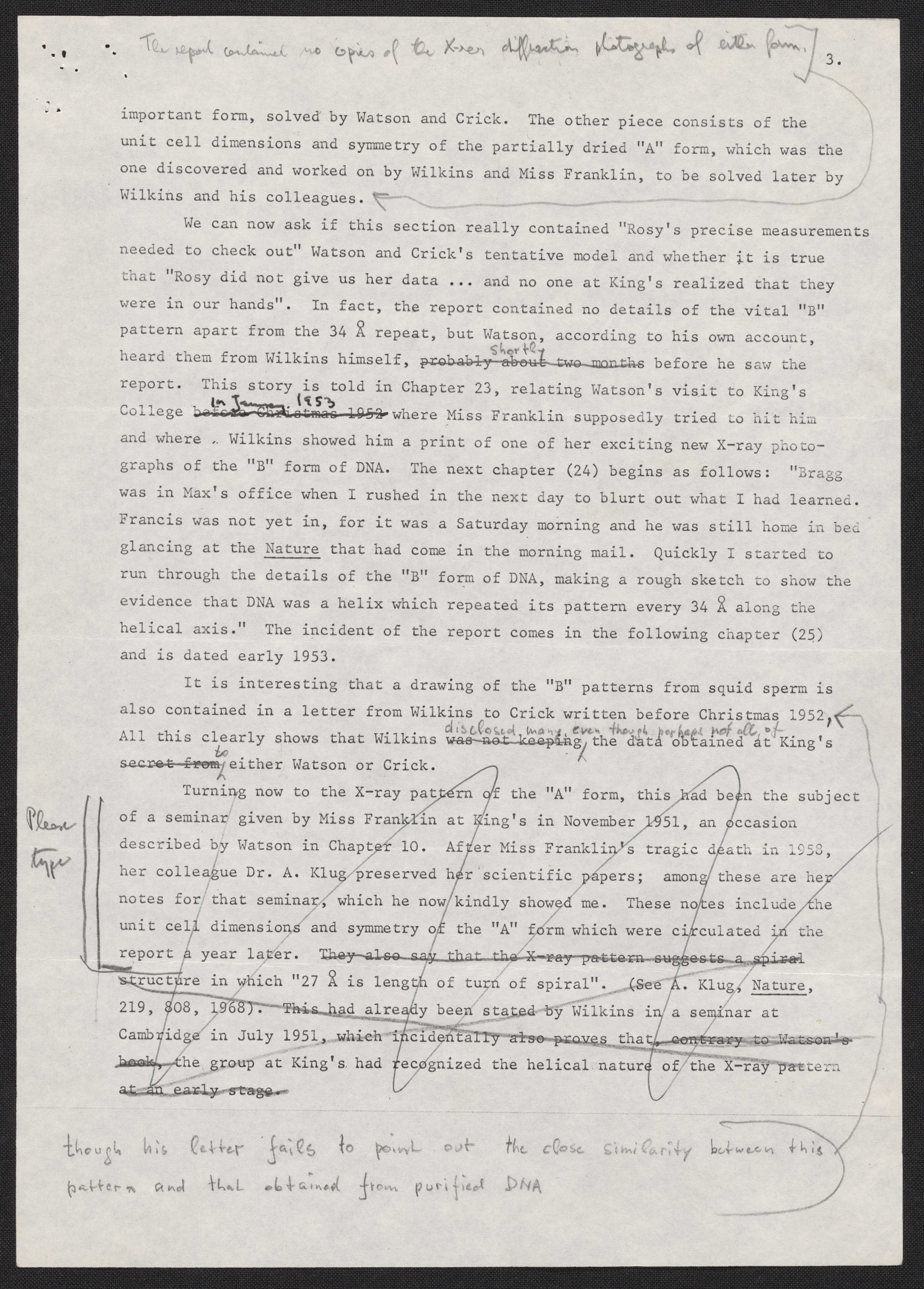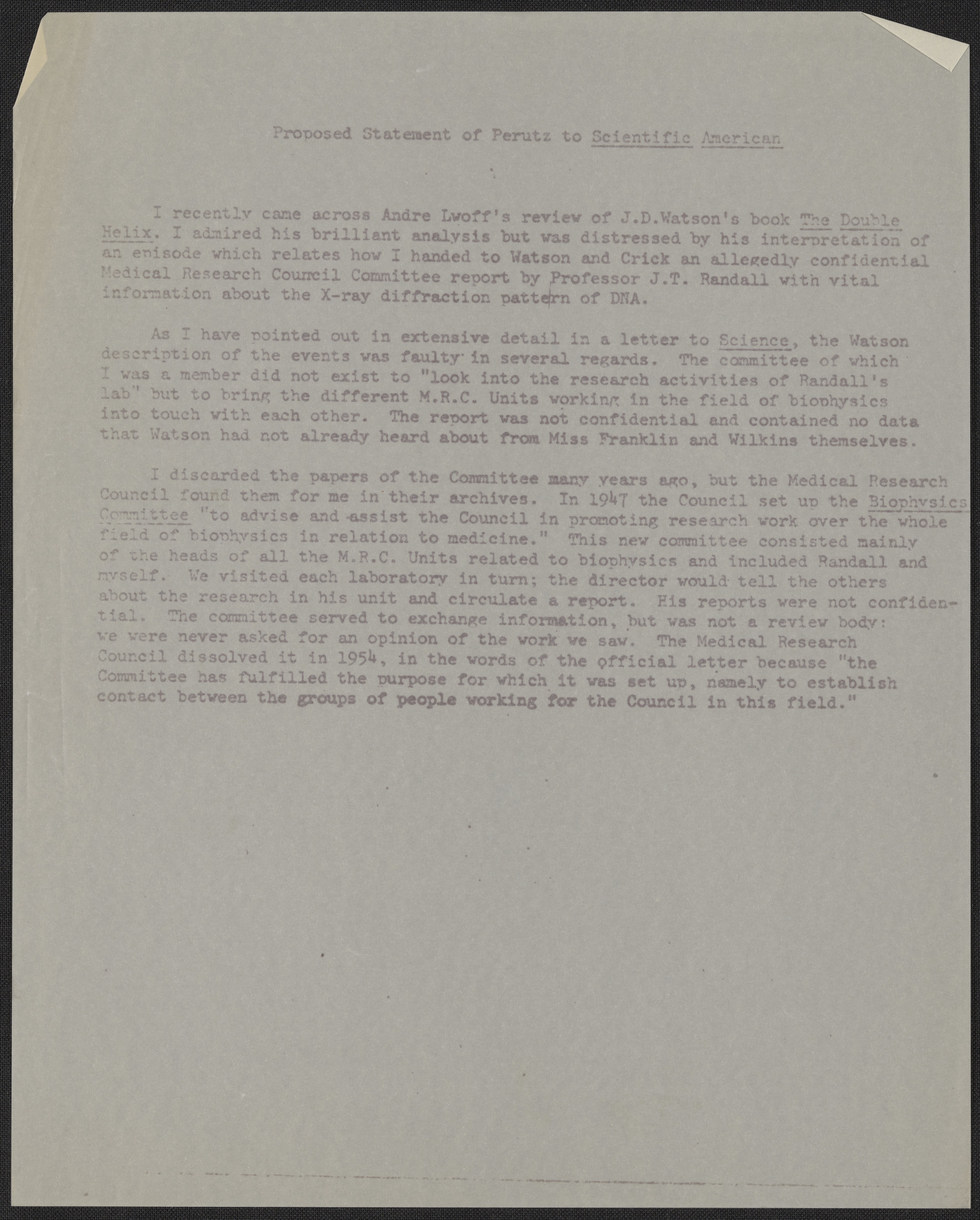 Small JPG1200 x 1701px — 351 KBLarge JPG2880 x 4081px — 1.8 MBFull-sized JPG5183 x 7345px — 5.5 MBOriginal fileTIFF — 5183 x 7345px — 109 MBDrafts of a letter to the editor of Scientific American, written by Max Perutz (1914-2002), regarding Andre Lwoff's (1902-1994) review of James D. Watson's (1928-2025) book The Double Helix.
