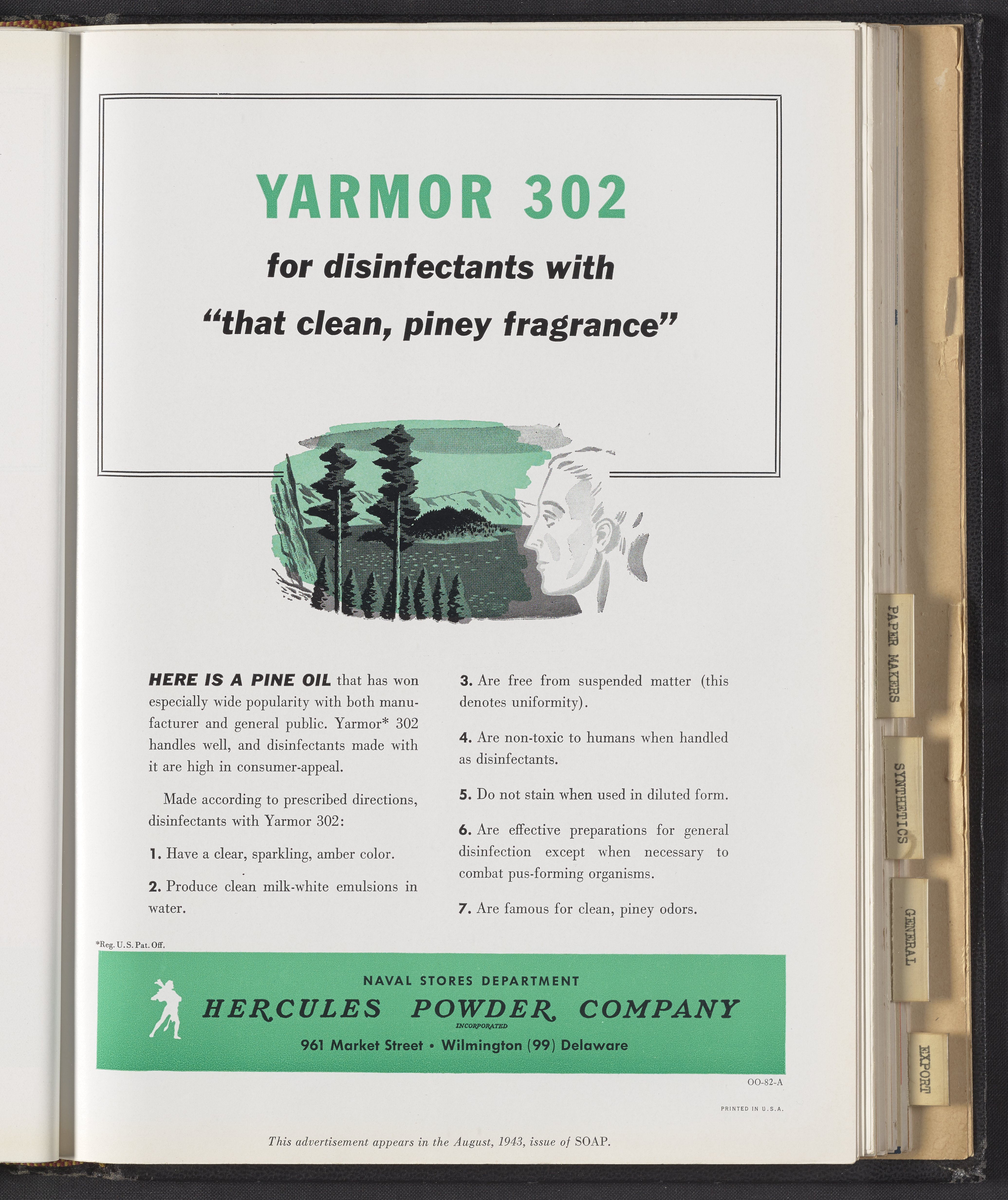 Hercules Incorporated. “Yarmor 302 for Disinfectants with ‘That Clean, Piney Fragrance.’” 1943 Hercules Advertisements, 1943. Records of Hercules Incorporated, Volume 1943. Science History Institute. Philadelphia. https://digital.sciencehistory.org/works/xg94hq26f.