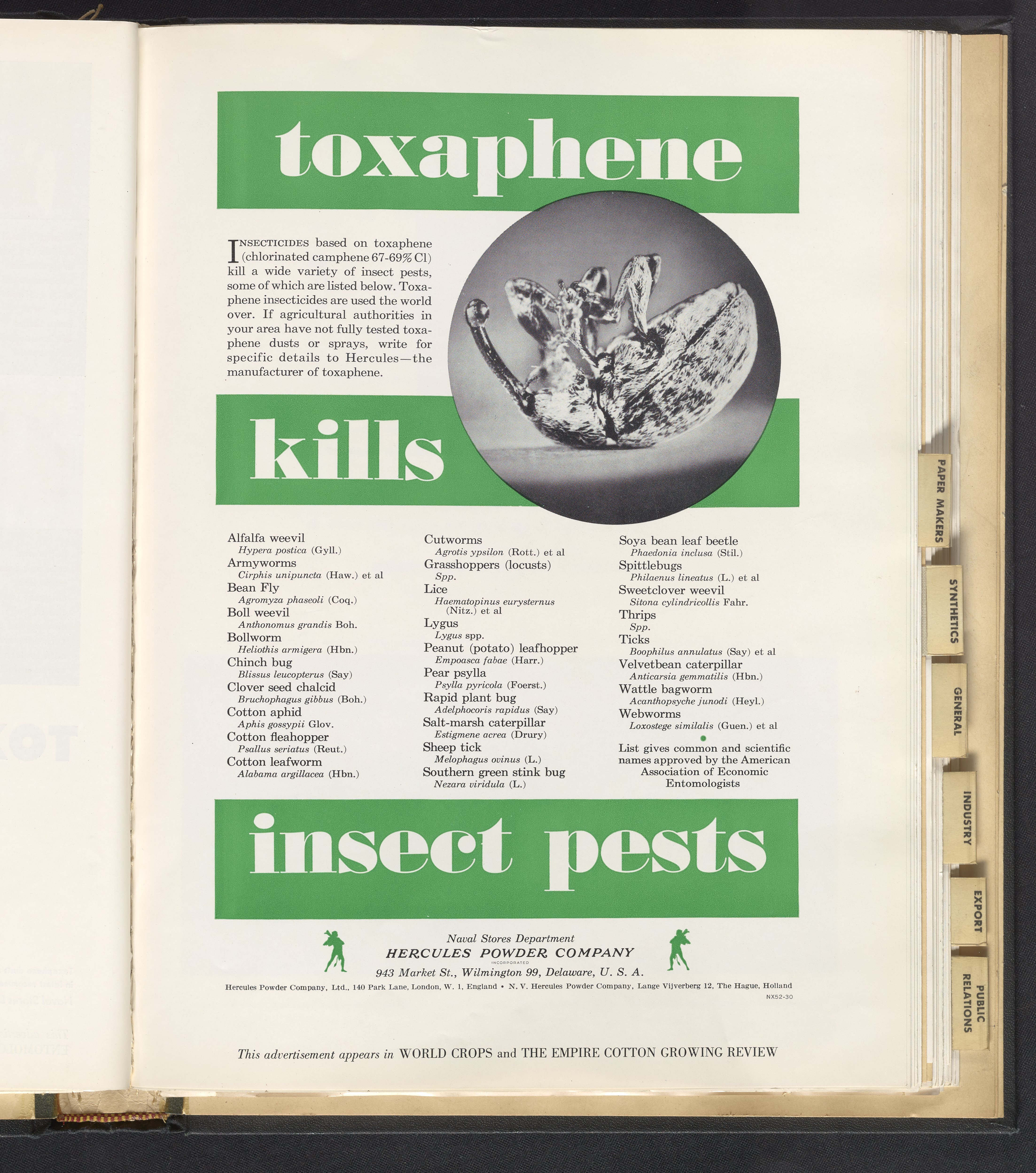 Hercules Incorporated. “Toxaphene Kills Insect Pests.” 1952 Hercules Advertisements, 1952. Records of Hercules Incorporated, Volume 1952. Science History Institute. Philadelphia. https://digital.sciencehistory.org/works/xg94hq39h.
