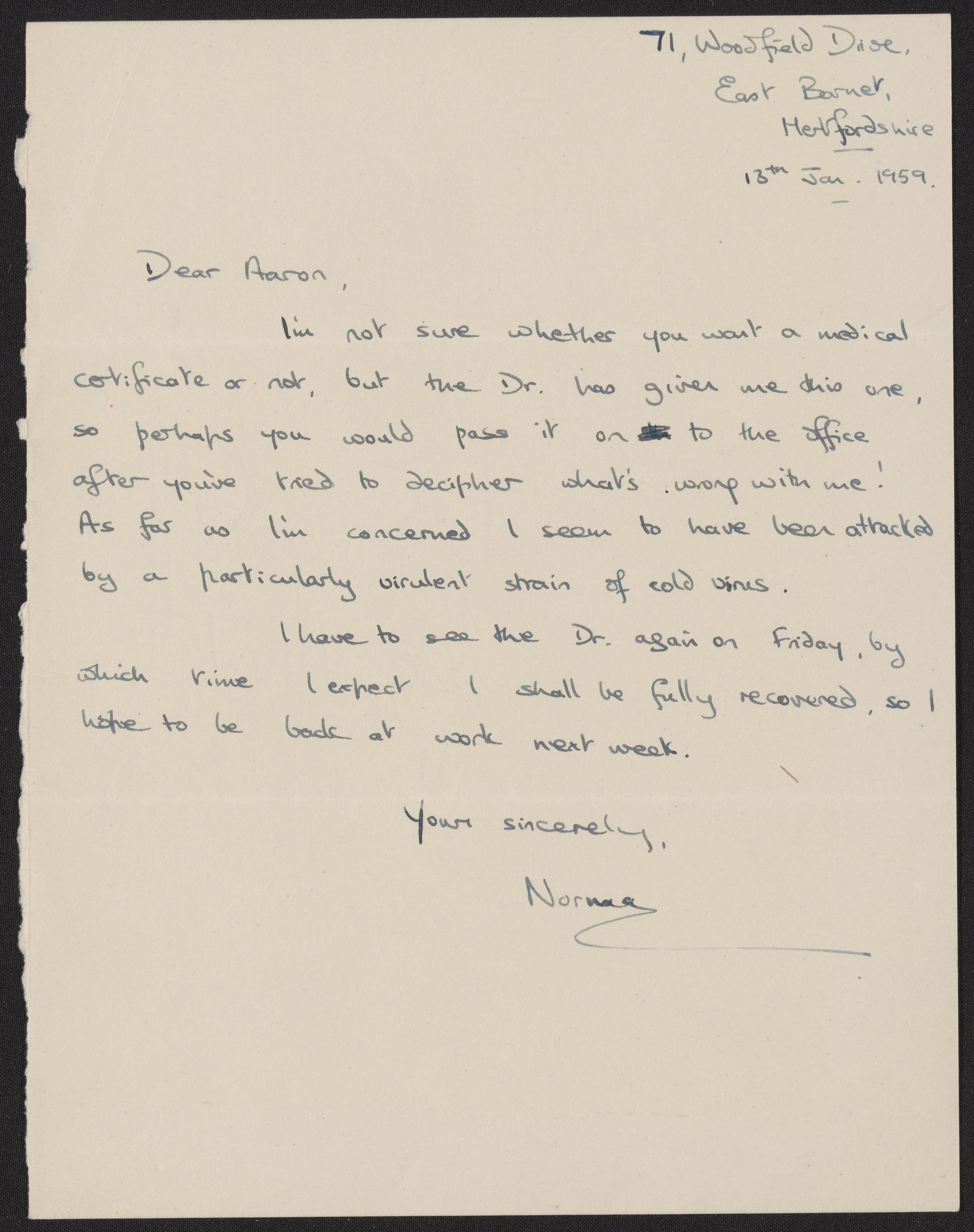 Letter from Norma R. Gordon to Aaron Klug, January 13, 1959