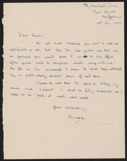 Gordon, Norma R. “Letter from Norma R. Gordon to Aaron Klug, January 13, 1959,” January 13, 1959. History of Molecular Biology Collection, Box 17, Folder 12. Science History Institute. Philadelphia. https://digital.sciencehistory.org/works/xhg42nb.