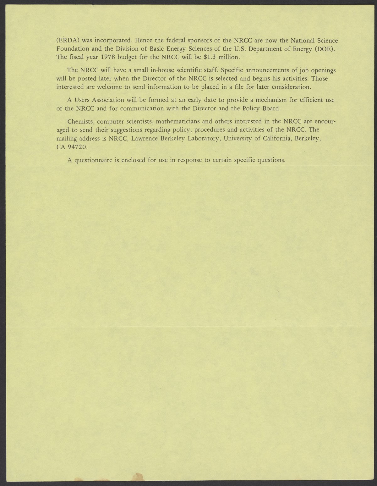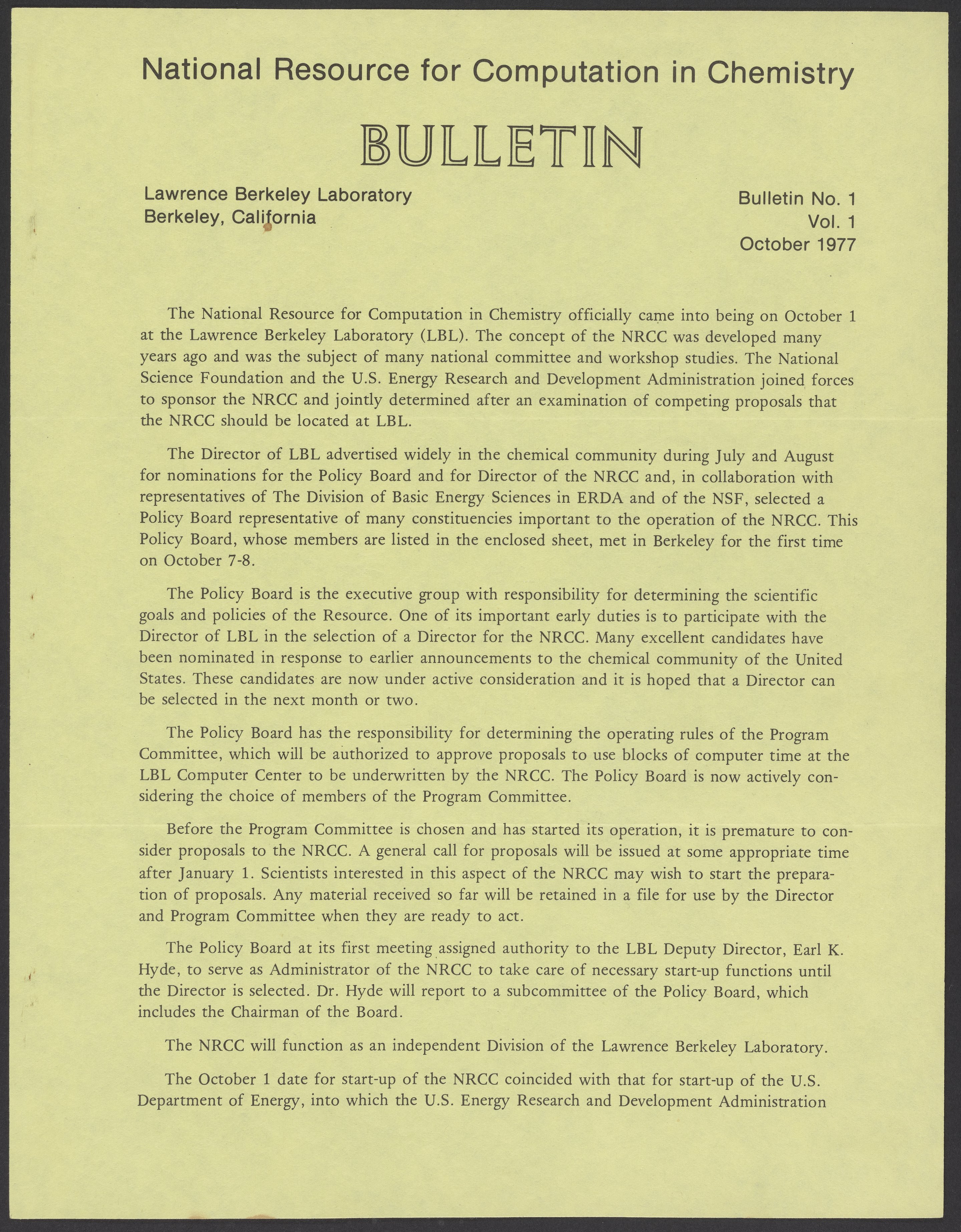 Small JPG1200 x 1537px — 351 KBLarge JPG2880 x 3690px — 1.8 MBFull-sized JPG5380 x 6893px — 5.9 MBOriginal fileTIFF — 5380 x 6893px — 106 MBVolume 1, no. 1 (October 1977) issue of the Bulletin of the National Resource for Computation in Chemistry (NRCC). Included in the bulletin is a questionnaire and list of the members of the NRCC policy board. 4 volumes of the Bulletin of were published; it ended with volume 4, no. 1 (Spring 1981)
