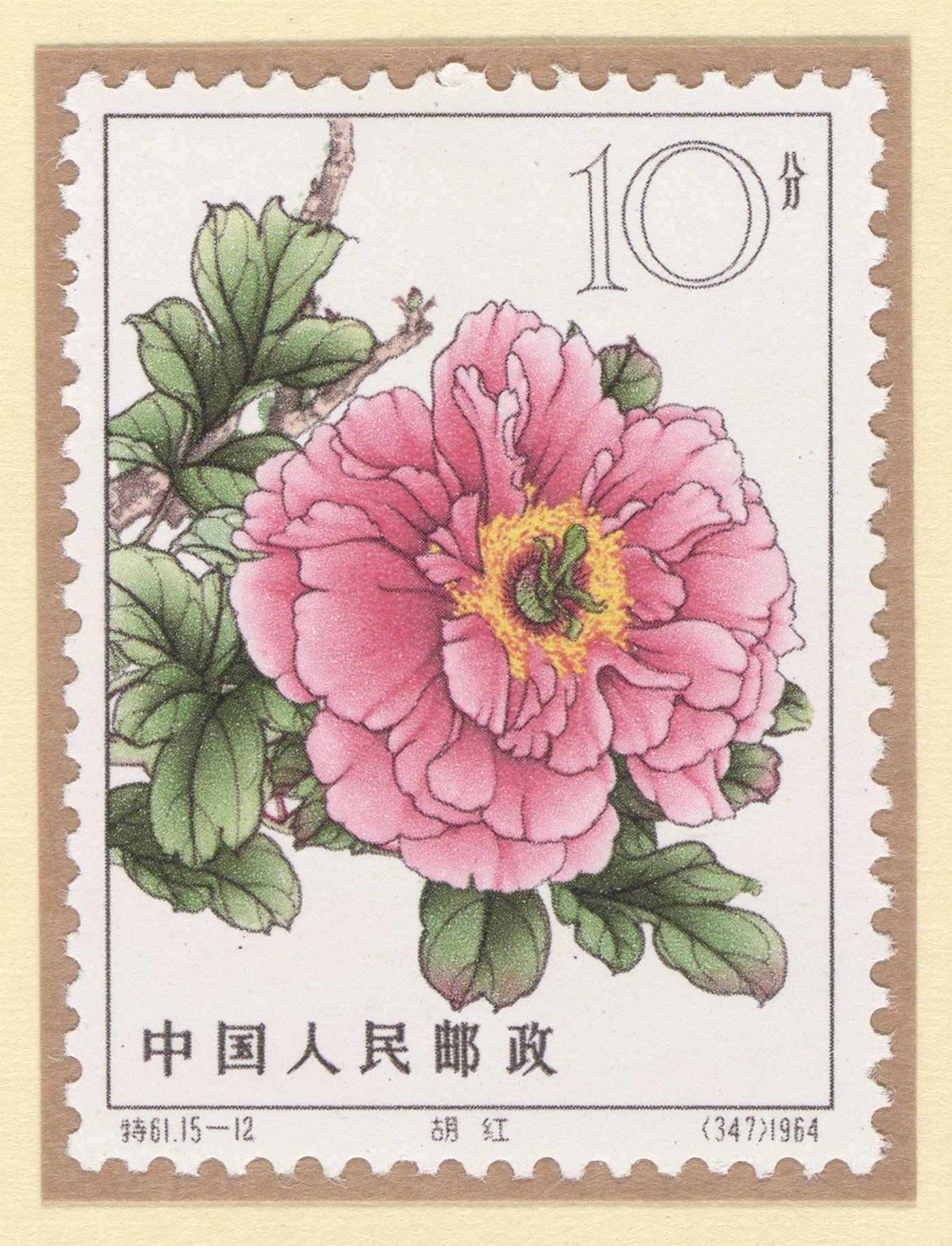 Postage stamp featuring an illustration of a variety of tree peonies called Hu’s Red (胡紅). This stamp is part of a stamp series titled "Tree Peonies," which was issued in 1964 by the People's Republic of China.
