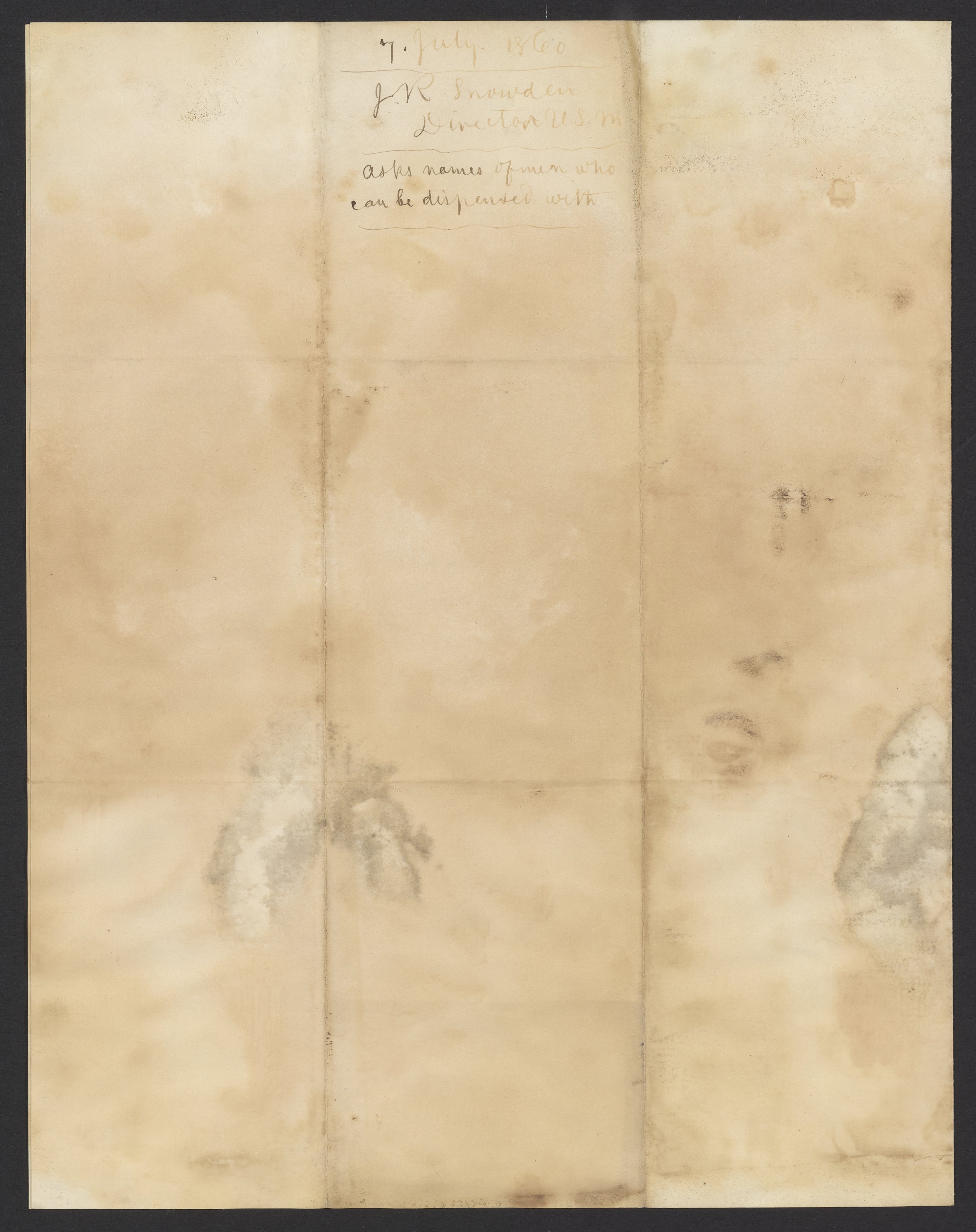 Small JPG1200 x 1518px — 193 KBLarge JPG2880 x 3643px — 1.1 MBFull-sized JPG3306 x 4182px — 1.4 MBOriginal fileTIFF — 3306 x 4182px — 39.6 MBJames Ross Snowden (1809-1878), Director of the United States Mint, asks James Curtis Booth (1810-1888) the names of men who can be dispensed with at the Mint.