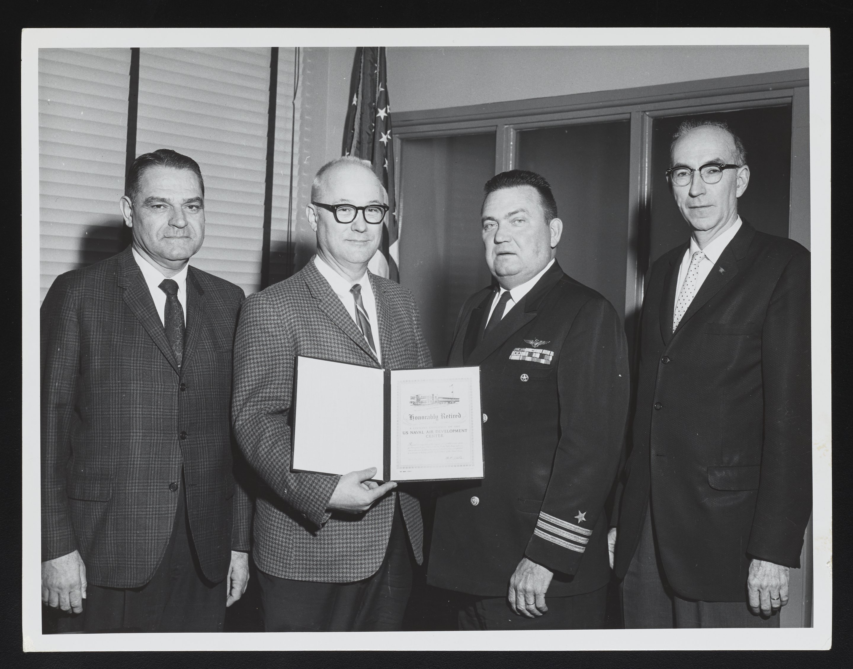 Retirement ceremony in honor of Edward K. Rishel, chemist at the Naval Air Engineering Center's Aeromaterials Laboratory. Rishel (center left) holds a certificate reading "Honorably Retired as a Civilian Employee of the U.S. Naval Air Development Center." The individuals in the photograph are identified as follows (from left): Charles A. Cassola (Head, High Polymer Division); Edward K. Rishel (Chemist, retiring); CDR Robert L. Abbott (Laboratory Director); and J. Hartley Bowen, Jr. (Technical Director).