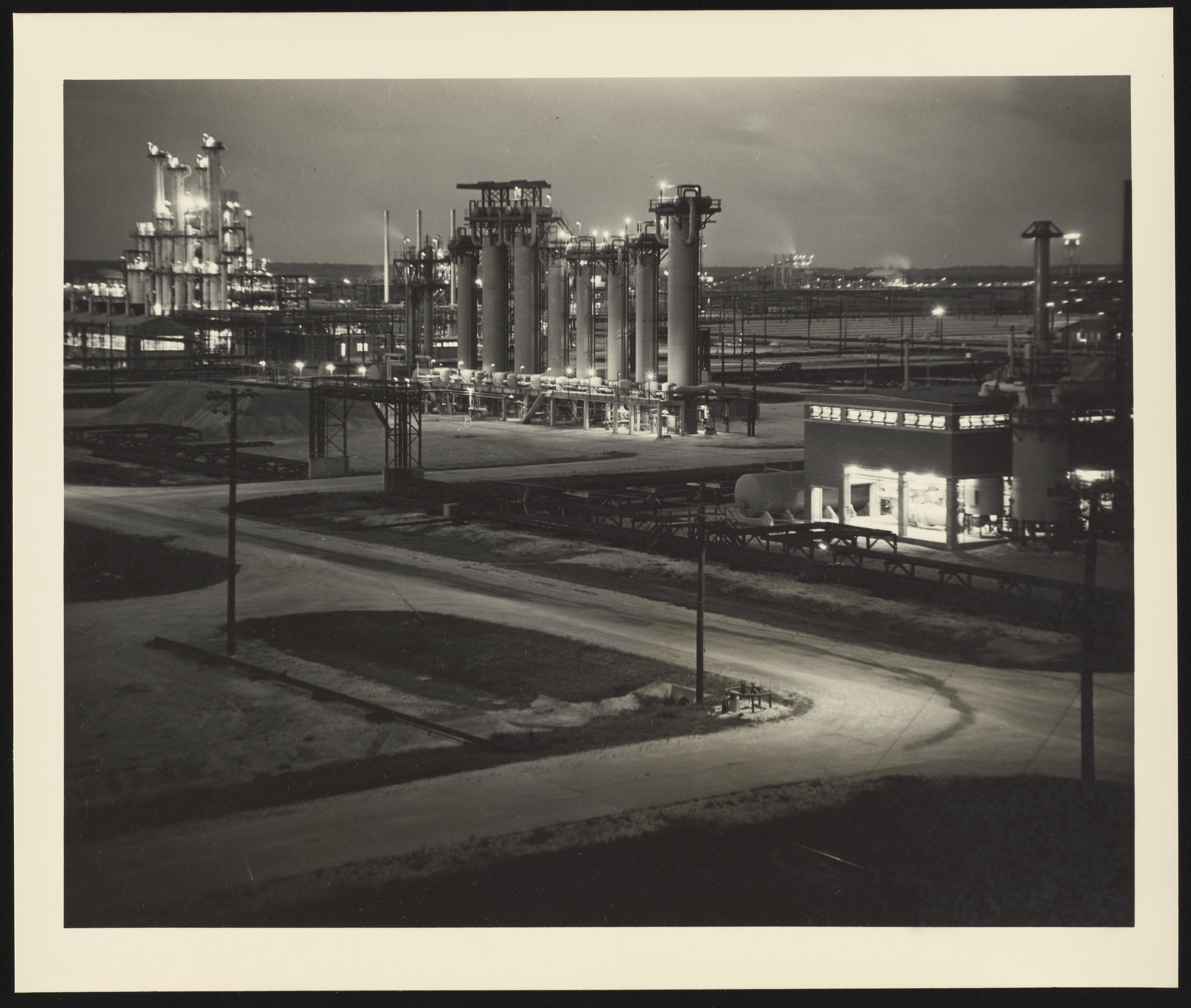 General exterior view, taken at night, of the Dow Chemical Company Texas Division plant located in Freeport, Texas. A range of products and processes were researched, developed, and produced at the plant, including chlorination, phenol, and magnesium.