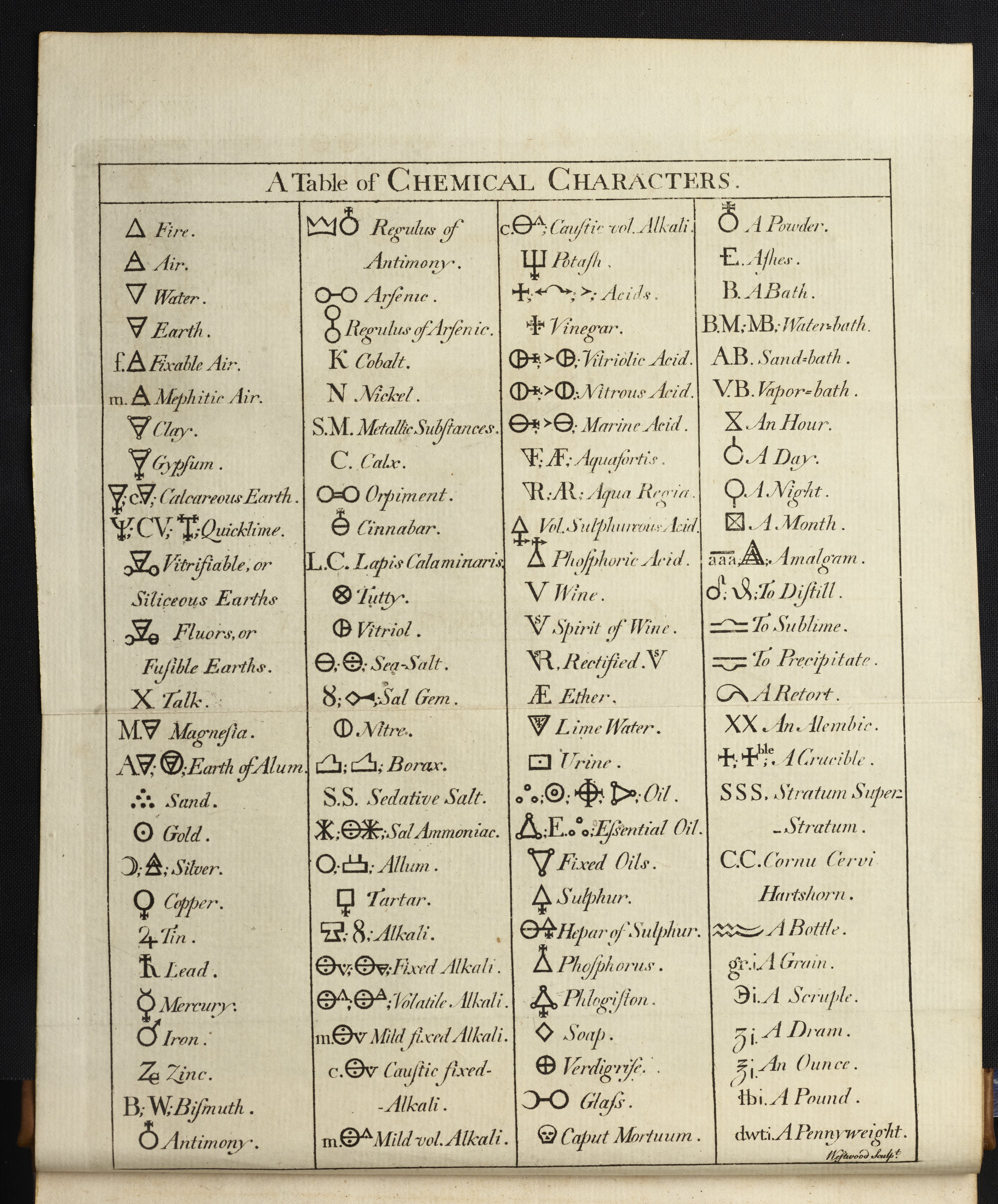 Macquer, Pierre Joseph. “A Table of Chemical Characters.” In A Dictionary of Chemistry, Vol. I. London, England: Peter Elmsley, 1777. https://digital.sciencehistory.org/works/xk81jm066.