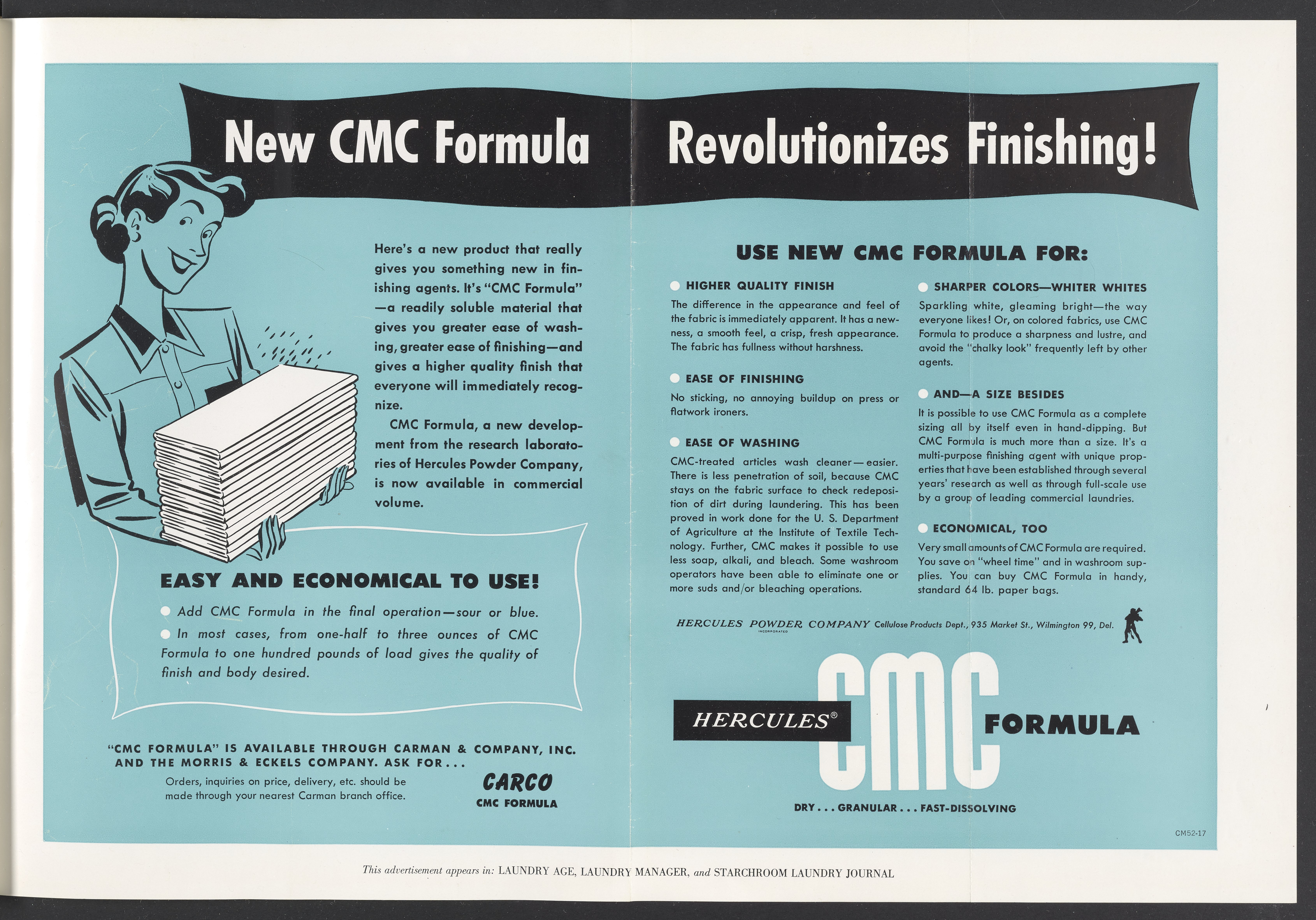 Color print advertisement for CMC Formula, a cellulose product manufactured and sold by Hercules Powder Company as a laundry finishing agent. The advertisement shows an illustration of a smiling woman holding a stack of laundry. The accompanying text details the use of Hercules CMC Formula as a finishing agent for commercial laundries. This advertisement appeared in Laundry Age, Laundry Manager, and Starchroom Laundry Journal.