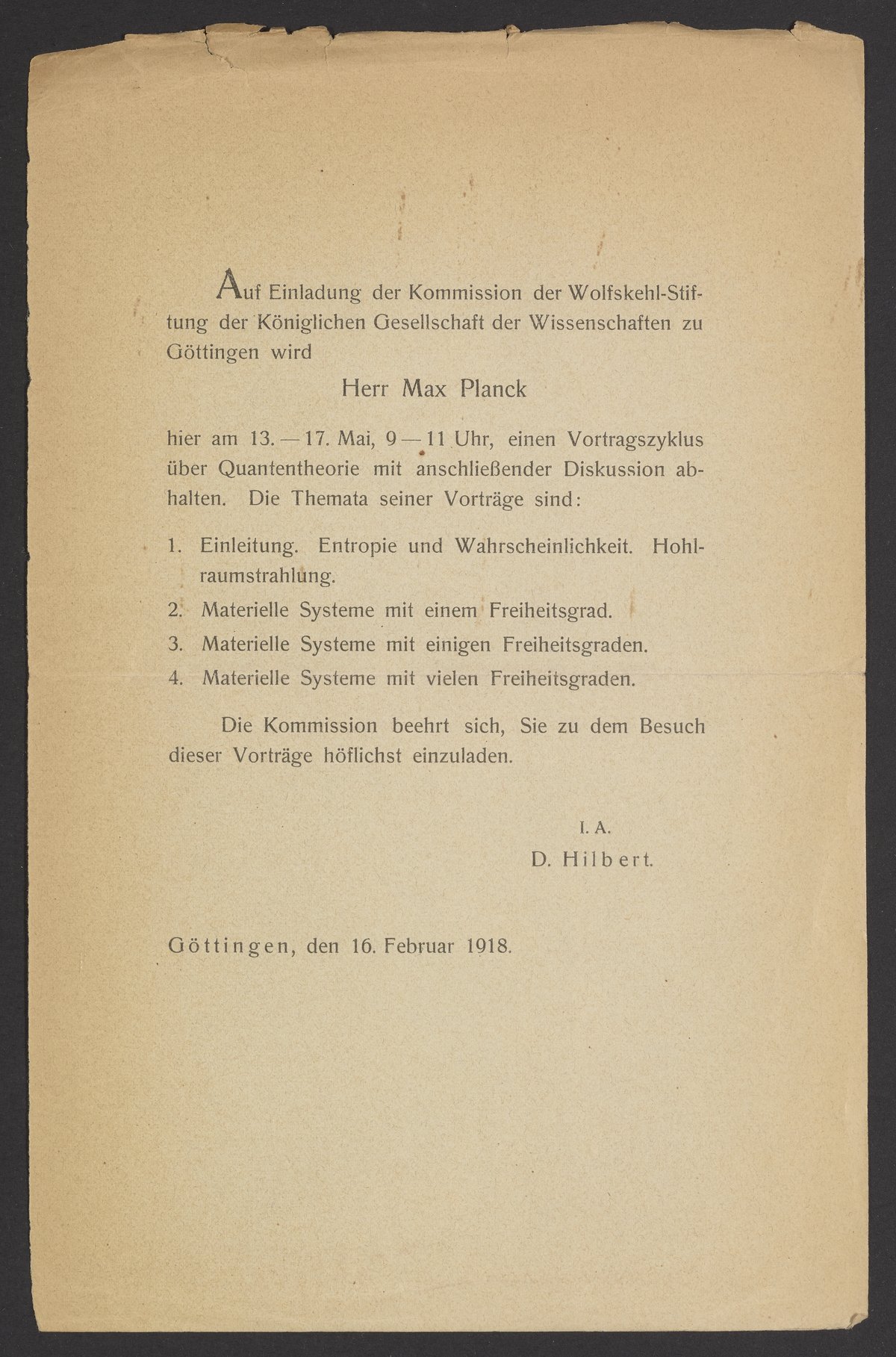 Invitation to lectures by Max Planck (1858- 1947) from the Wolfskehl Foundation Commission of the Royal Society of Sciences in Gottingen.