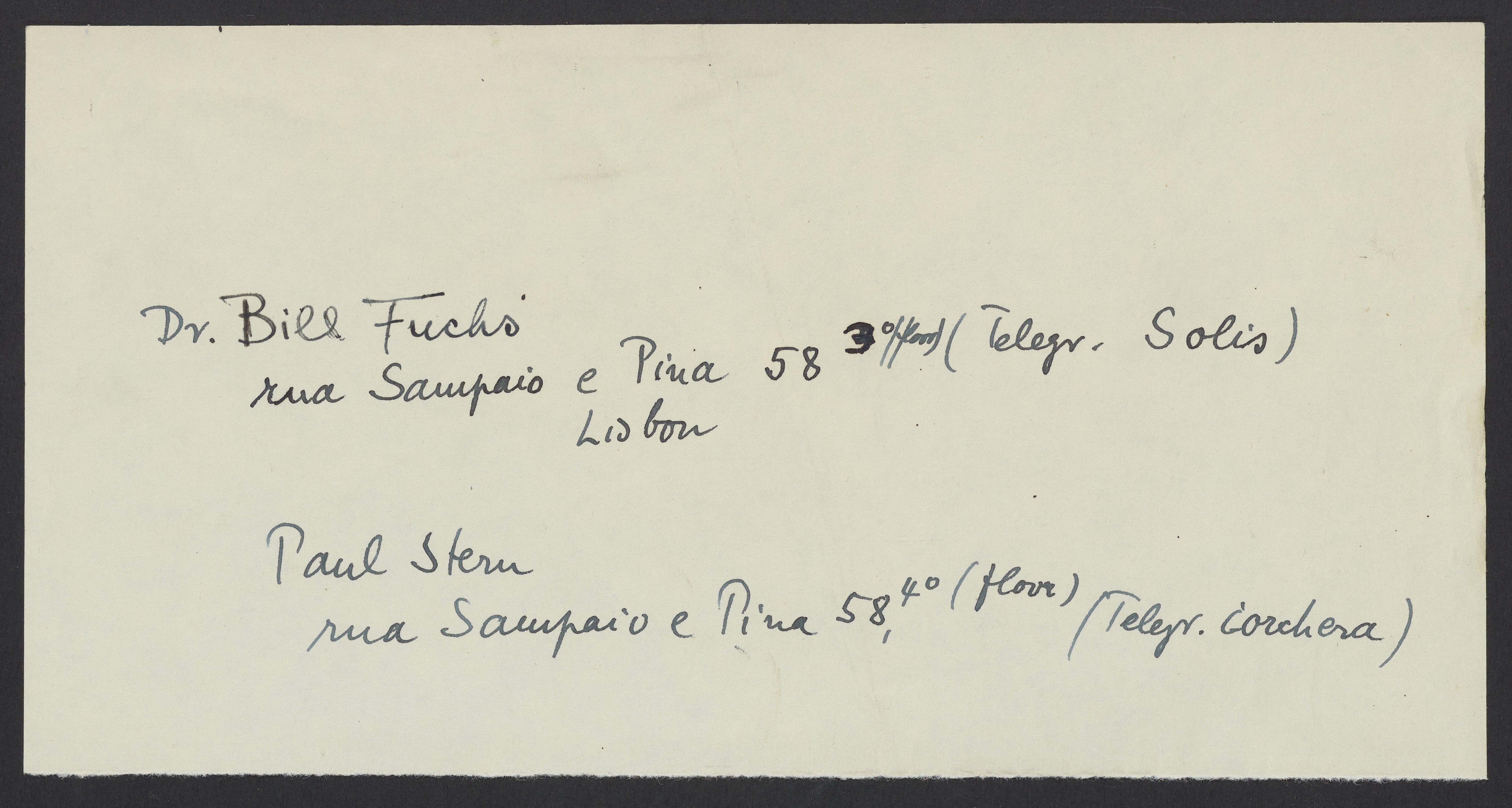 Note with addresses for Wilhelm (Bill) Werner Fuchs and Paul Stern. Fuchs and Stern were major contributors in aiding Jewish refugees immigrating from Europe during the second world war. In particular, they greatly assisted in supporting the immigration of the Bredig family.