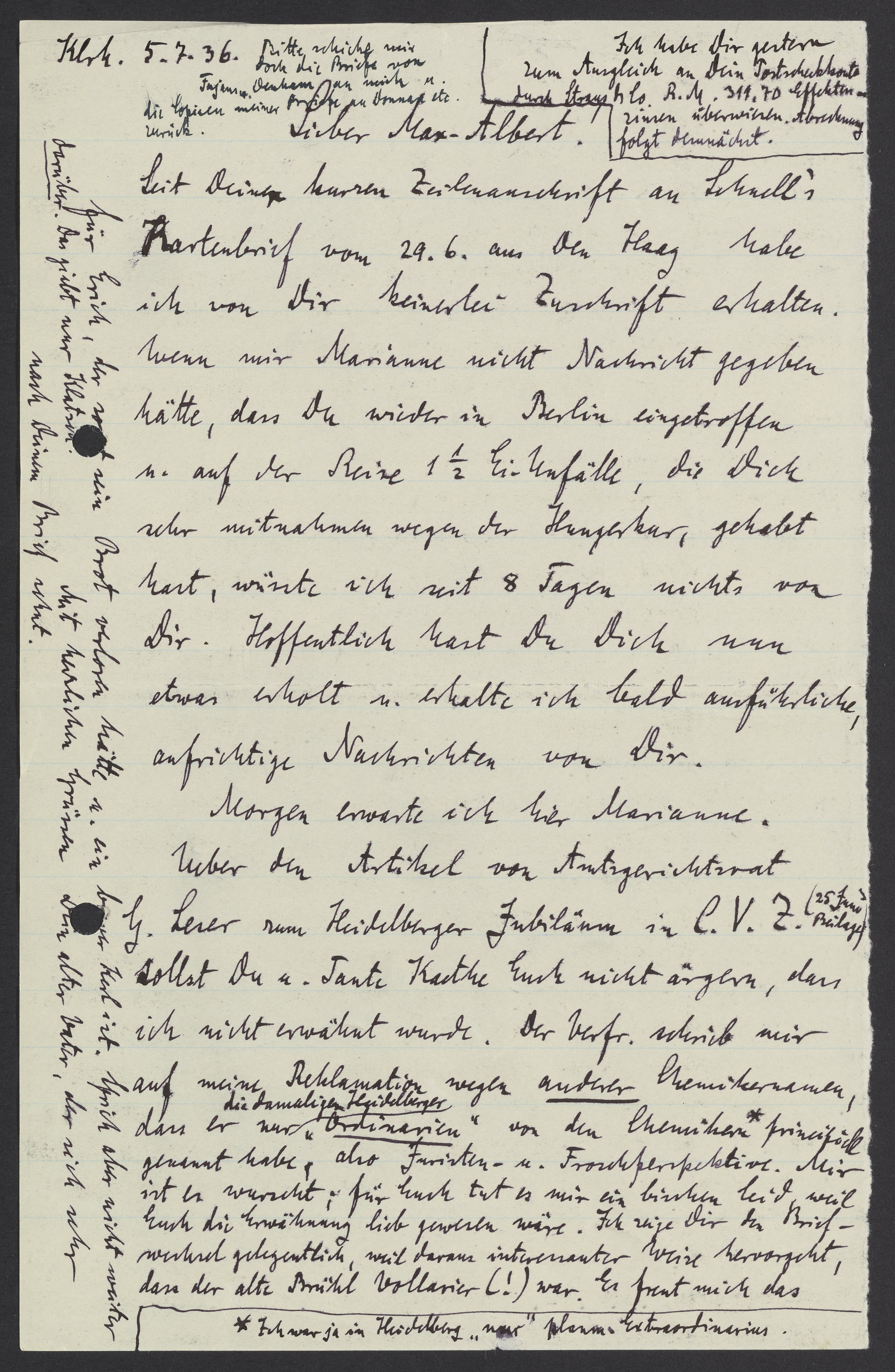 Morgen erwarte ich hier Marianne. Ueber den Artikel von Amtsgerichtrat G. Leser zum Heidelberger Jubiläum in C.V.Z (25 Juni Beilage) sollst Du und Tante Kaethe nicht ärgern, dass ich nicht erwähnt wurde. Der Verf. schrieb mir auf meine Reklamation wegen anderer Chemikernamen, dass er nur die damaligen Heidelberger „Ordinarien“ von den Chemikern principiell genannt habe, also Juristen – u. Froschperspektive. Mir ist es wurscht; für Euch tut es mir ein bisschen leid weil Euch die Erwähnung lieb gewesen wäre. Ich zeige Dir den Briefwechsel gelegentlich, weil daraus interessanter Weise hervorgeht, dass der alte Brühl Vollarier (!) war. Es freut mich