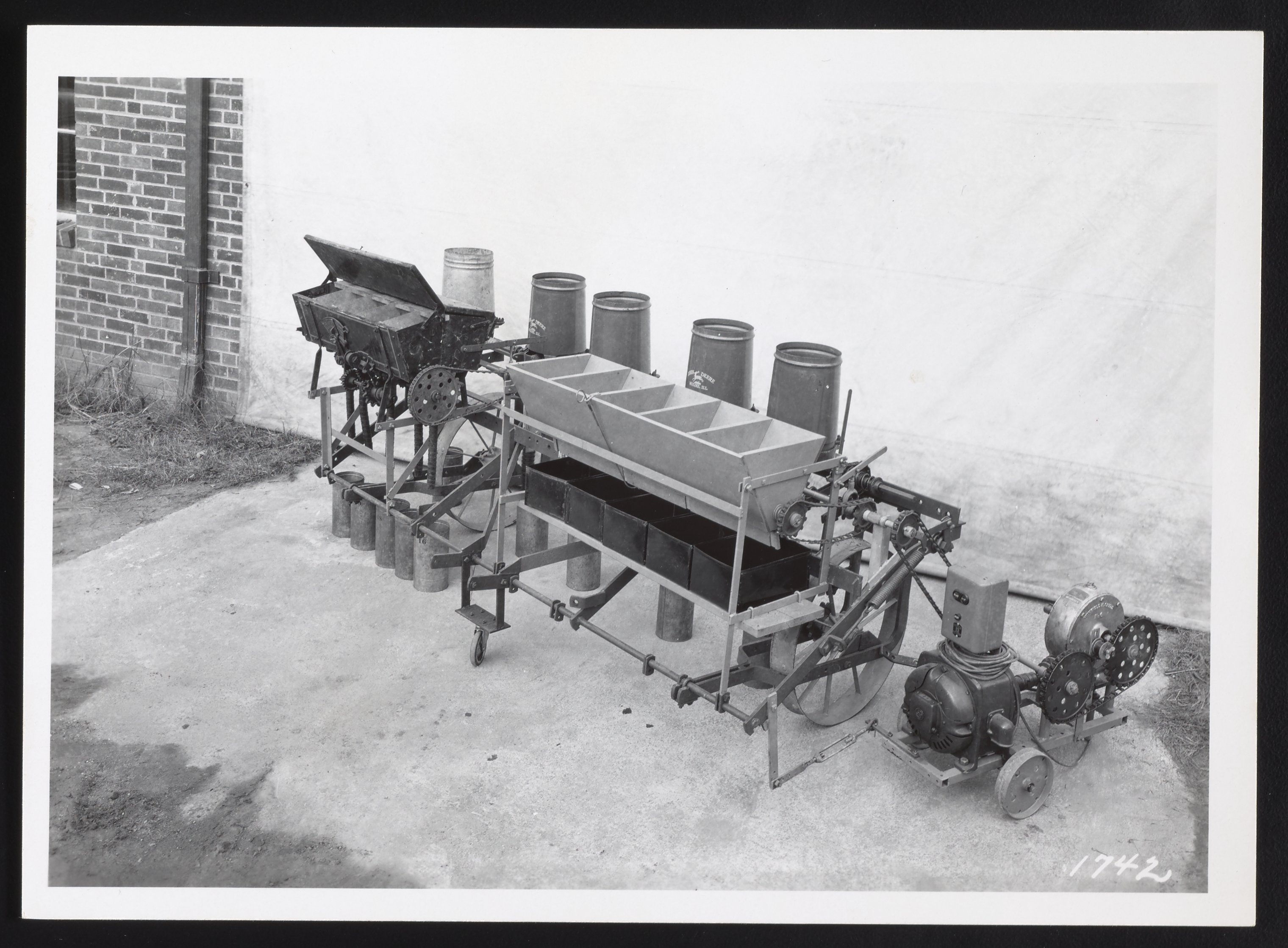 General view of a drillability apparatus with fertilizer hoppers, a starwheel, and rotating plate mechanism at an unidentified U.S. Department of Agriculture facility.