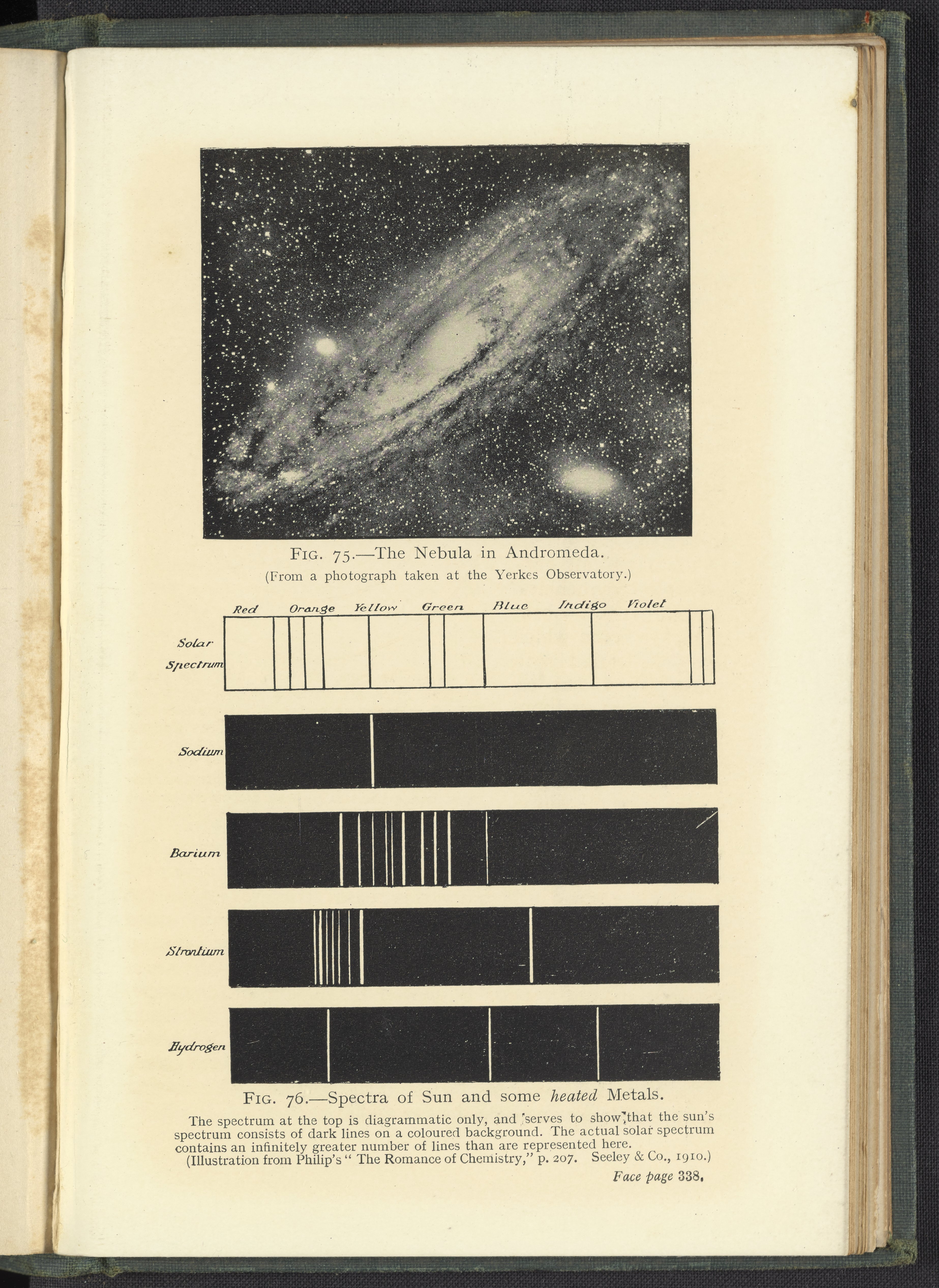 Martin, Geoffrey. “Fig. 75: The Nebula in Andromeda; Fig. 76: Spectra of Sun and Some Heated Metals.” Triumphs & Wonders of Modern Chemistry. New York, New York: D. Van Nostrand Company, 1913. https://digital.sciencehistory.org/works/xp68kg68h.