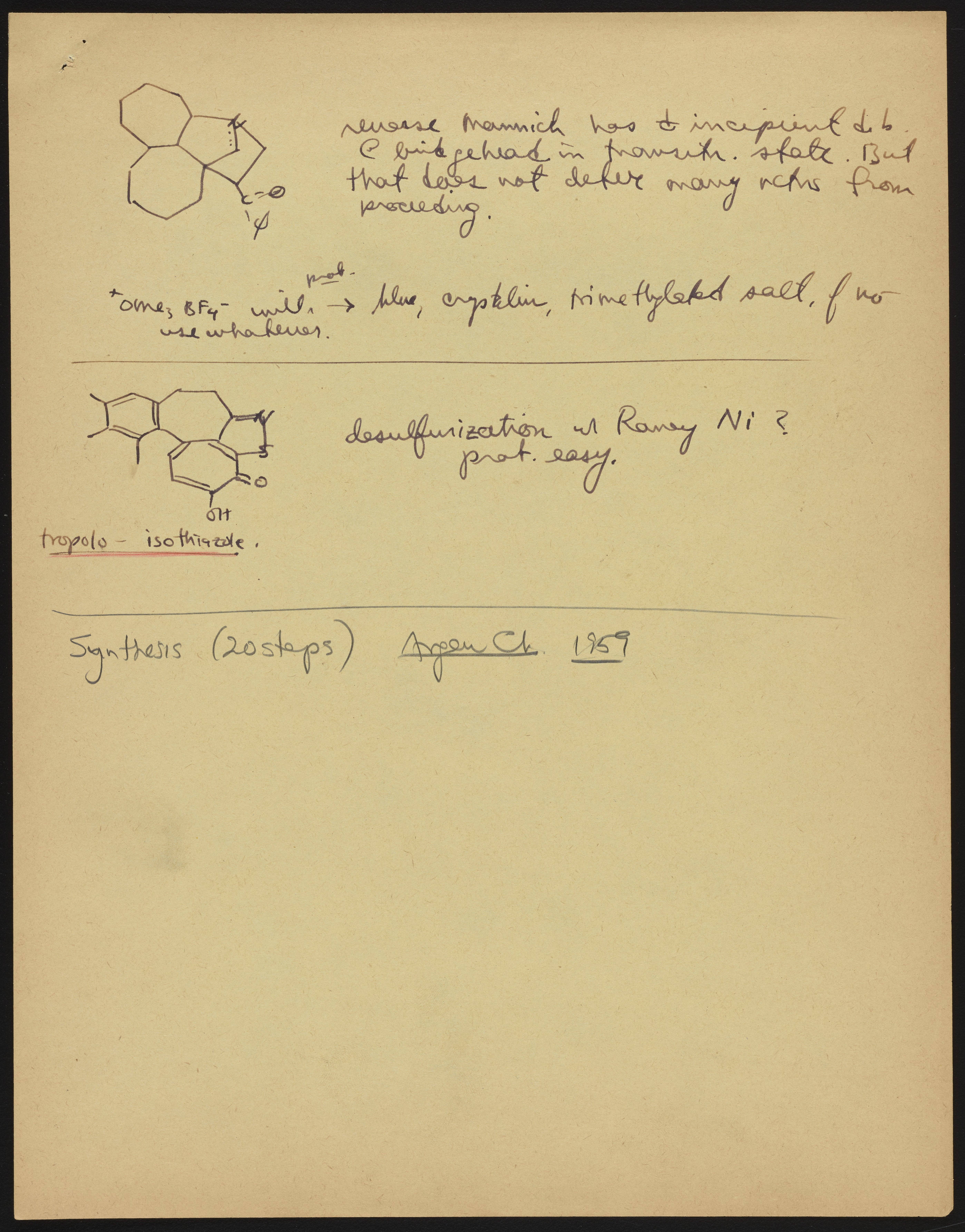 Kohler, Robert E. “R. B. (Robert Burns) Woodward Seminar Entitled ‘Colchicine.’” Notes from R. B. (Robert Burns) Woodward's Seminars, circa 1959–1966. Folder 2. Science History Institute. Philadelphia. https://digital.sciencehistory.org/works/xp68kh266.