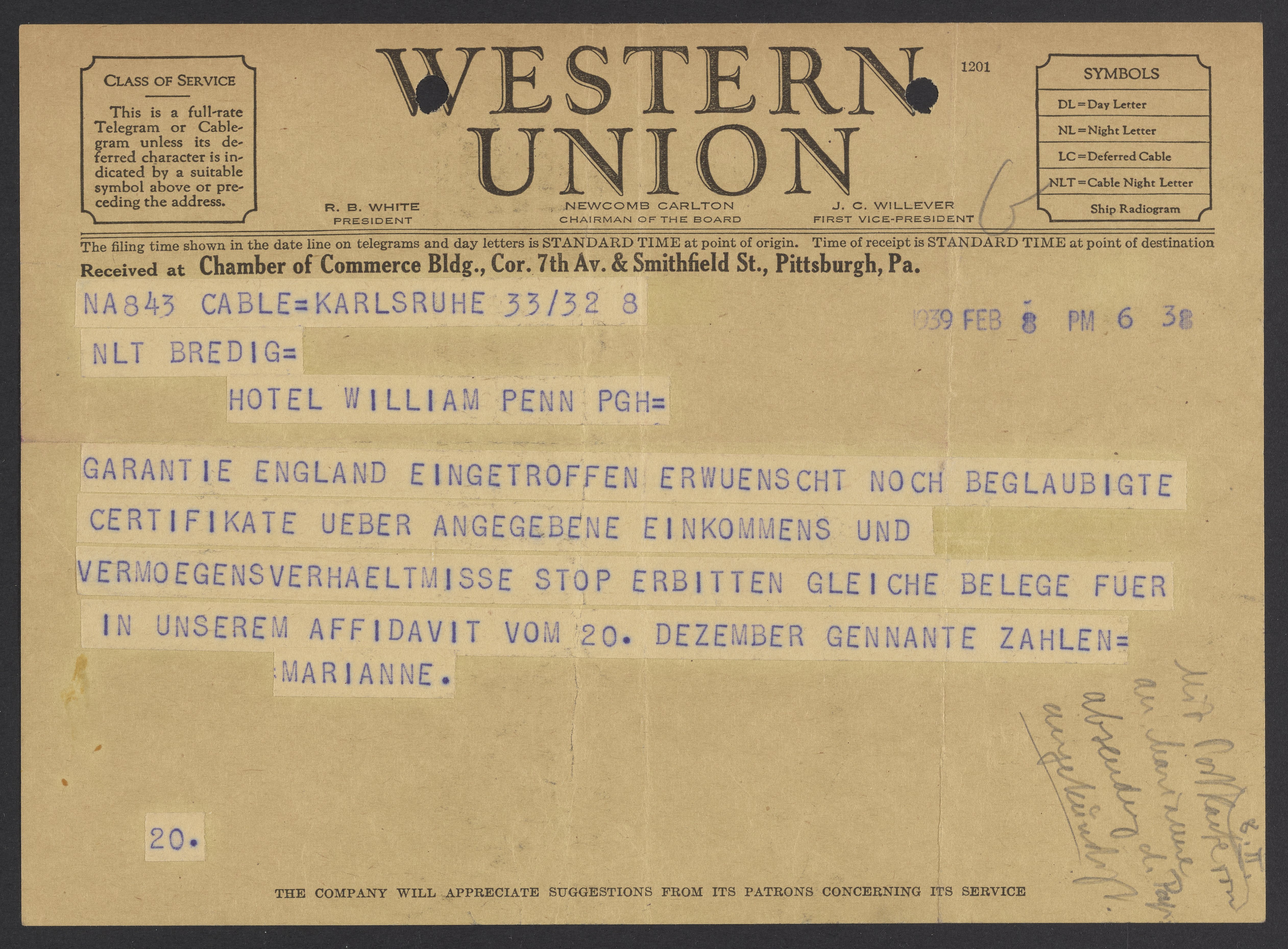 Telegram from Marianne Homburger to Max Bredig, February 8, 1939