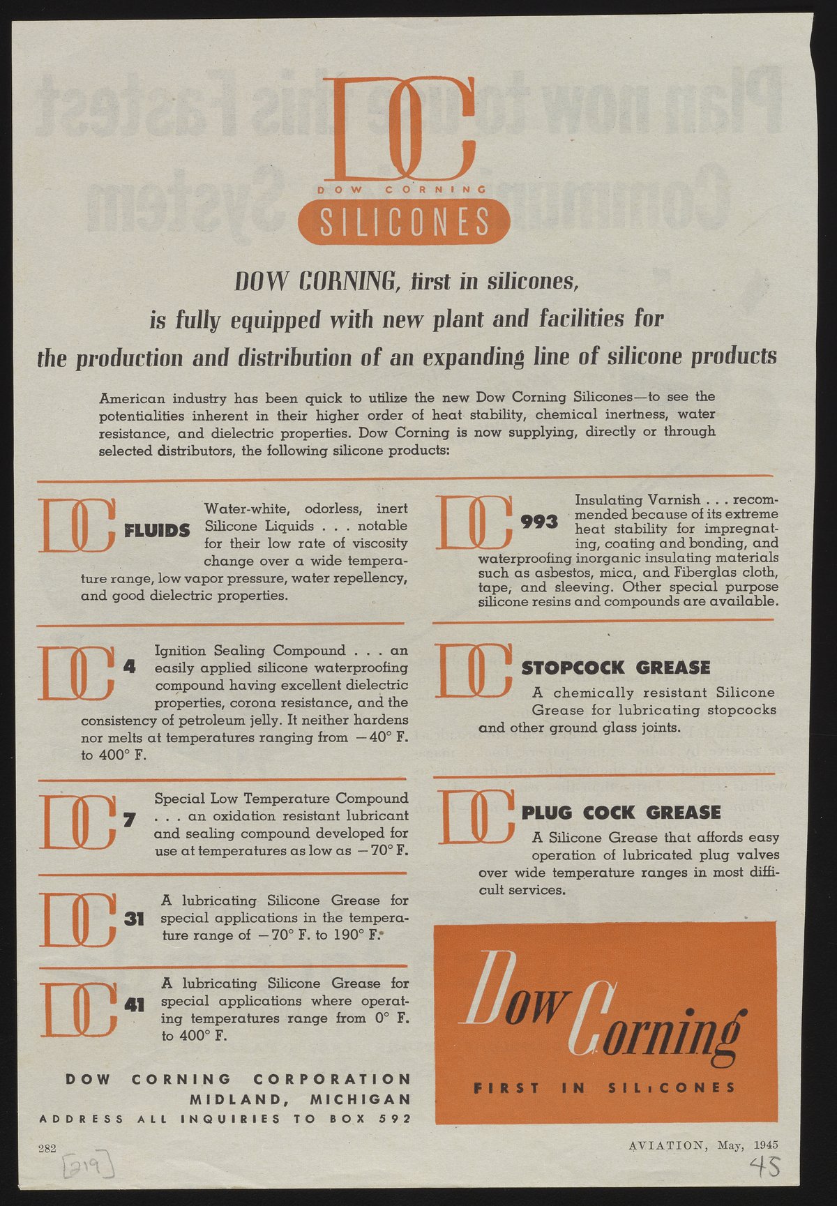 Dow Corning Corporation. “Advertisement for Dow Corning Silicones,” May 1945. Advertisements from the Dow Chemical Historical Collection, Box 7. Science History Institute. Philadelphia. https://digital.sciencehistory.org/works/xs55mc623.
