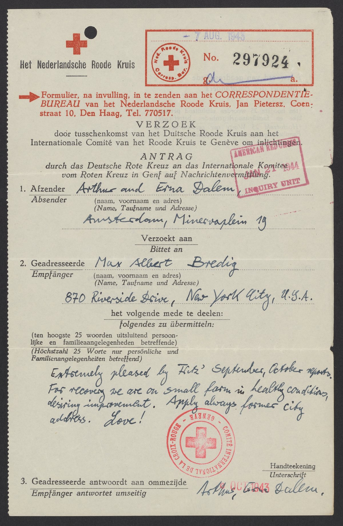 Message from Arthur and Erna Dalem (Alfred and Eva Schnell) to Max Bredig, August 7, 1943