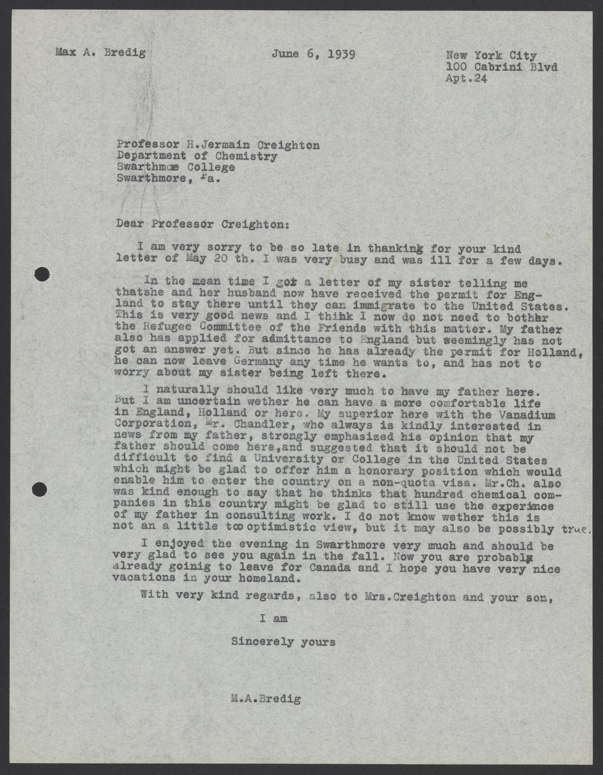 Max Bredig (1902-1977) writes to H. Jermain Creighton, a professor of Chemistry at Swarthmore College, with updates on his family. His father, Georg Bredig (1868-1944), has been given permission to leave Germany for Holland, though Max feels pressure to have him immigrate to the United States. Max's sister and brother-in-law, Marianne (1903-1986) and Viktor Homburger (1888-1968), have received a permit to stay in England until they are able to immigrate to the United States.