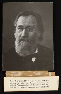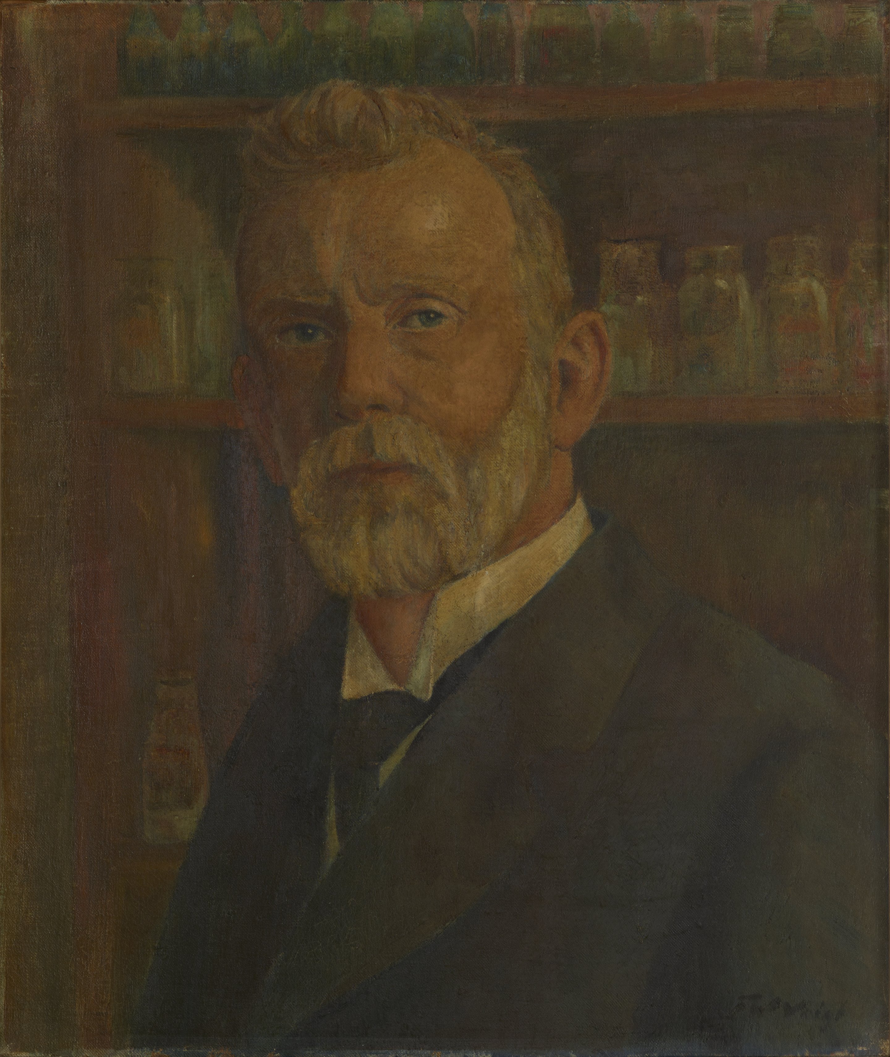 Portrait of Paul Erhlich, recipient of the 1908 Nobel Prize in Physiology or Medicine for his contributions to immunology. Ehrlich was a German Jewish physician and scientist who worked in the fields of hematology, immunology, and chemotherapy. This painting shows Ehrlich as a bearded man in late middle age, calmly contemplating the viewer as he stands before shelves of books and glassware.