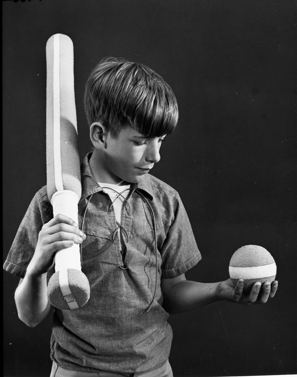 Boy posed with Styrofoam ball and baseball bat