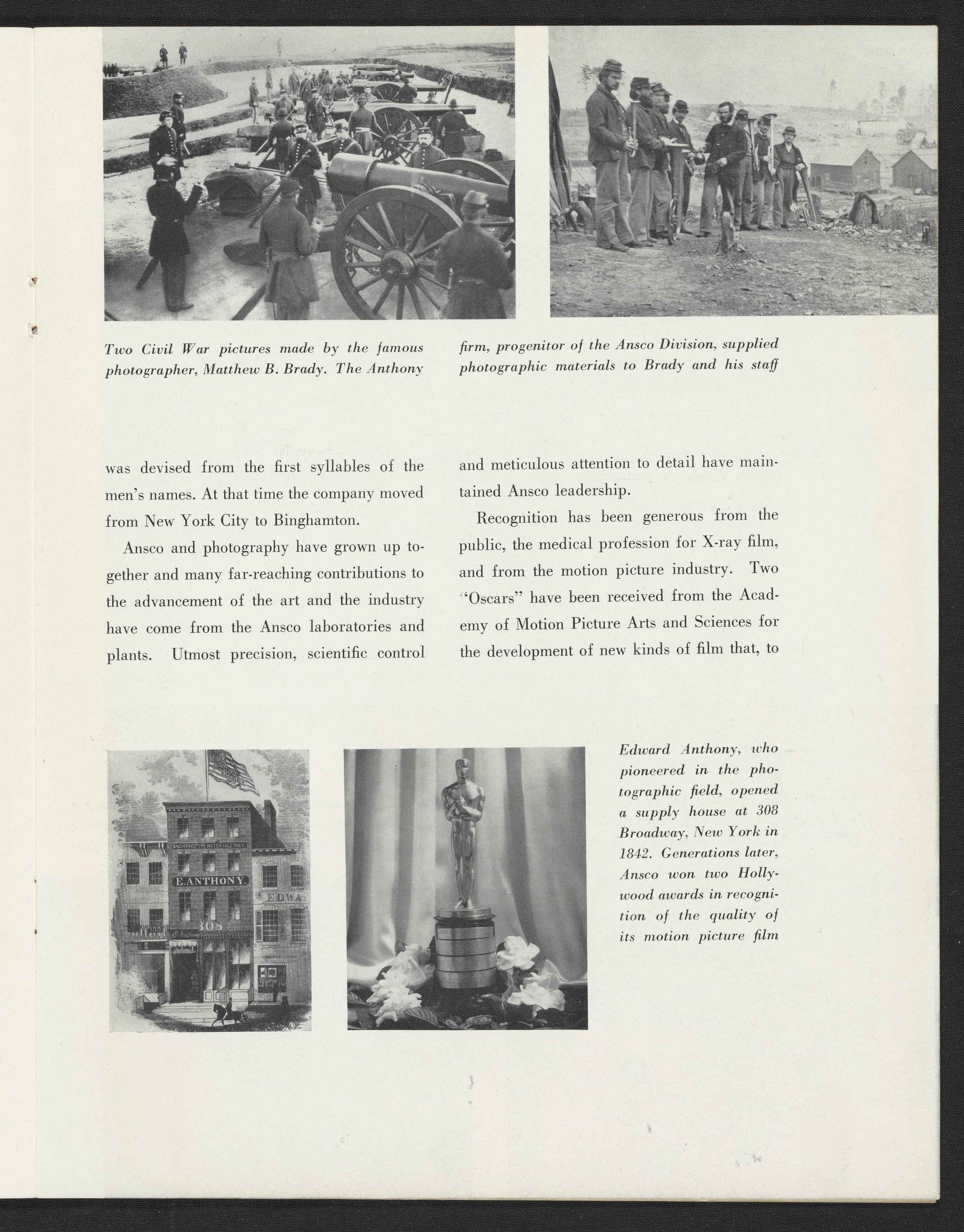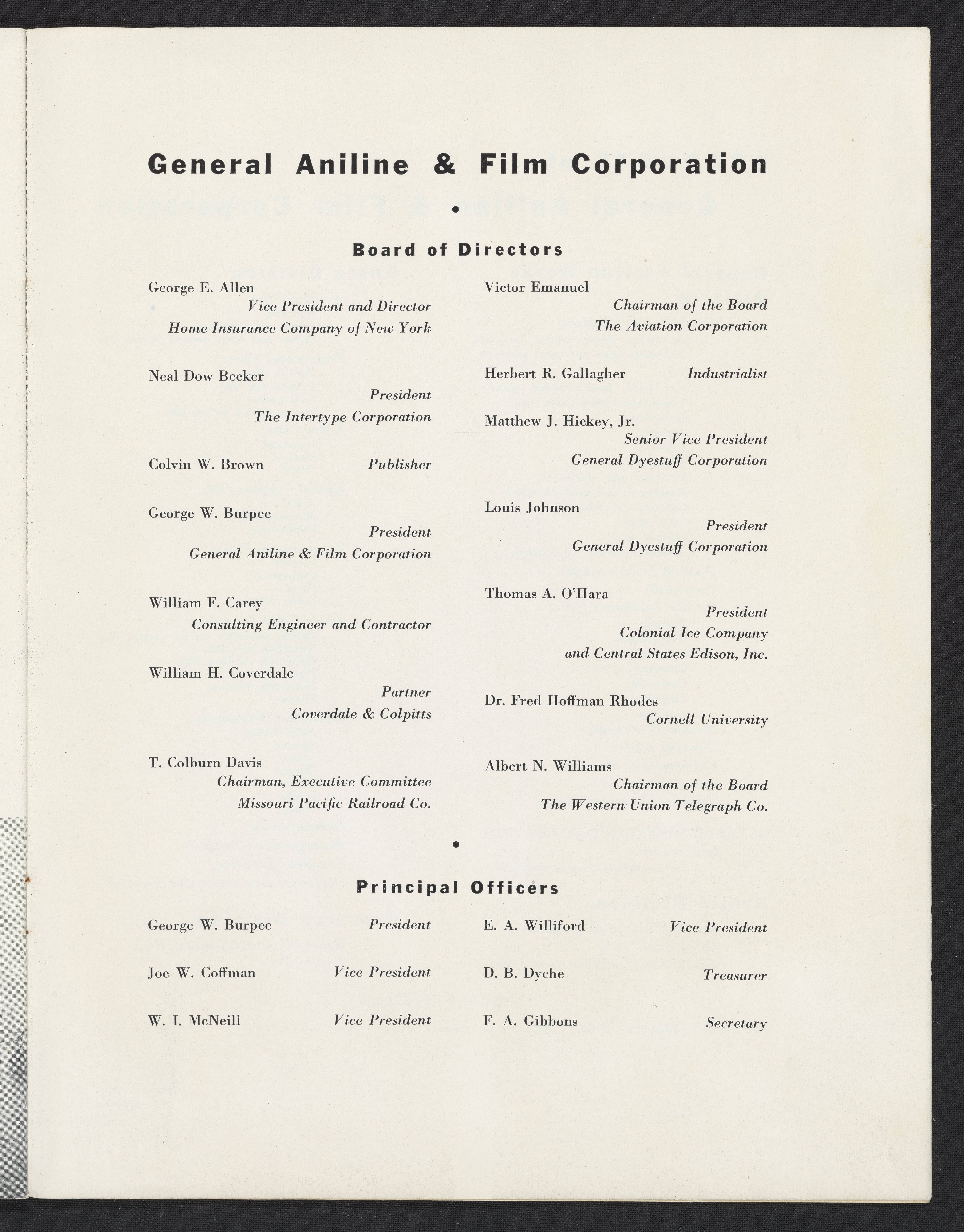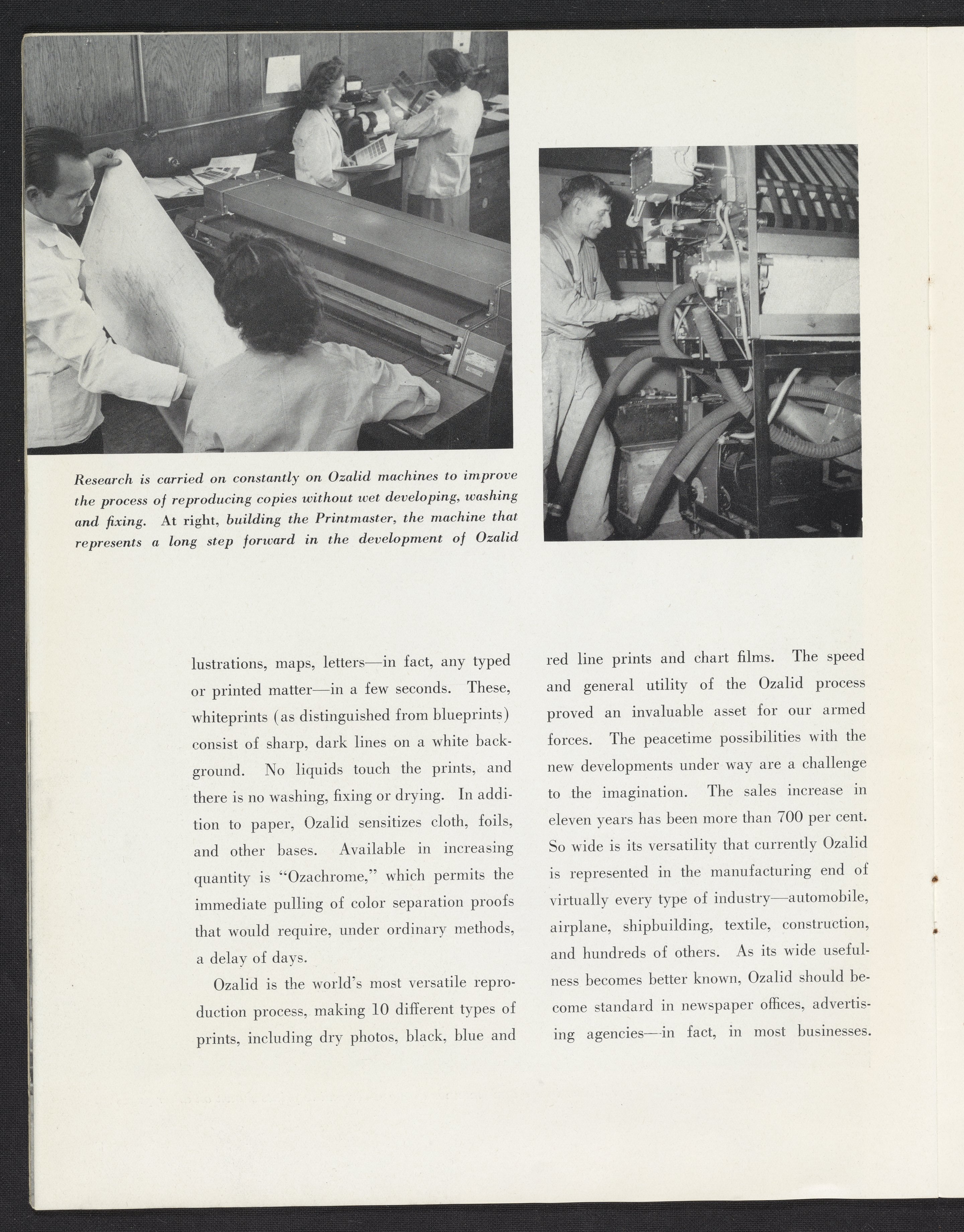 Small JPG1200 x 1538px — 267 KBLarge JPG2880 x 3691px — 2.2 MBFull-sized JPG5370 x 6883px — 7.6 MBOriginal fileTIFF — 5370 x 6883px — 106 MBDigitized in entirety, this illustrated work outlines the history of the General Aniline & Film Corporation. Intended as an advertising brochure, includes information on the General Aniline Works Division, detailing operations within their dye factory and manufacturing plant; the Ansco Division, where the manufacturing of photographic products occurs including the manufacturing of Ansco Color film and paper; the Ozalid Division, where their all-in-one Ozalid exposure and dry development photography equipment is made. There is also a section on research, a section entitled "In War and Peace" on the company's activities during World War II as well as a section entitled "Looking Ahead."