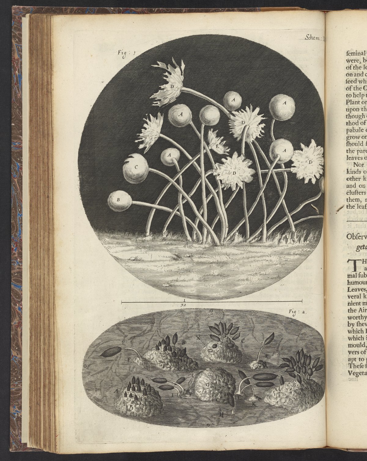 Hooke, Robert. “Microscopic View of Leaves and Molds.” In Micrographia : or, Some Physiological Descriptions of Minute Bodies Made by Magnifying Glasses. With Observations and Inquiries Thereupon. London, England: J. Martyn, 1665. https://digital.sciencehistory.org/works/xw42n912b.