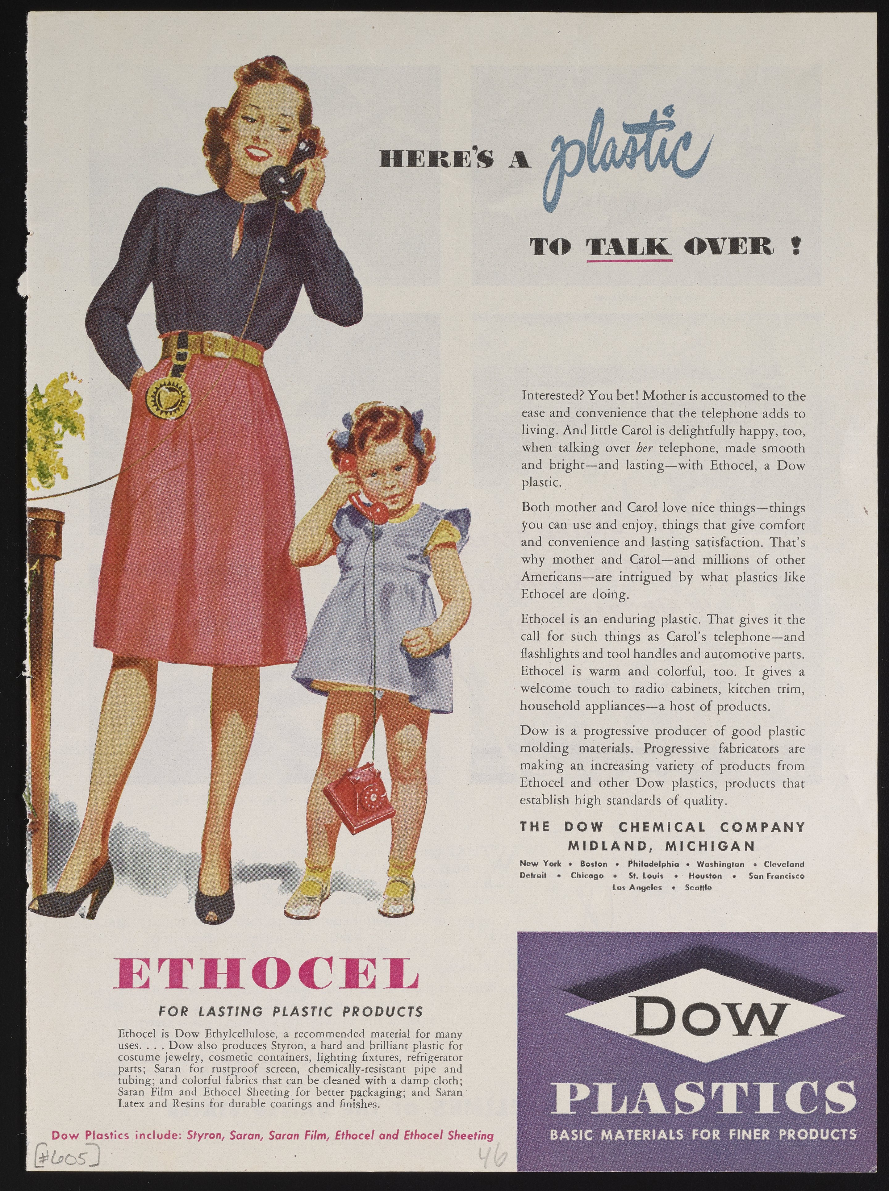Dow Chemical Company. “Here's a Plastic to Talk Over!,” circa 1946. Advertisements from the Dow Chemical Historical Collection, Box 9. Science History Institute. Philadelphia. https://digital.sciencehistory.org/works/xw66uw4.