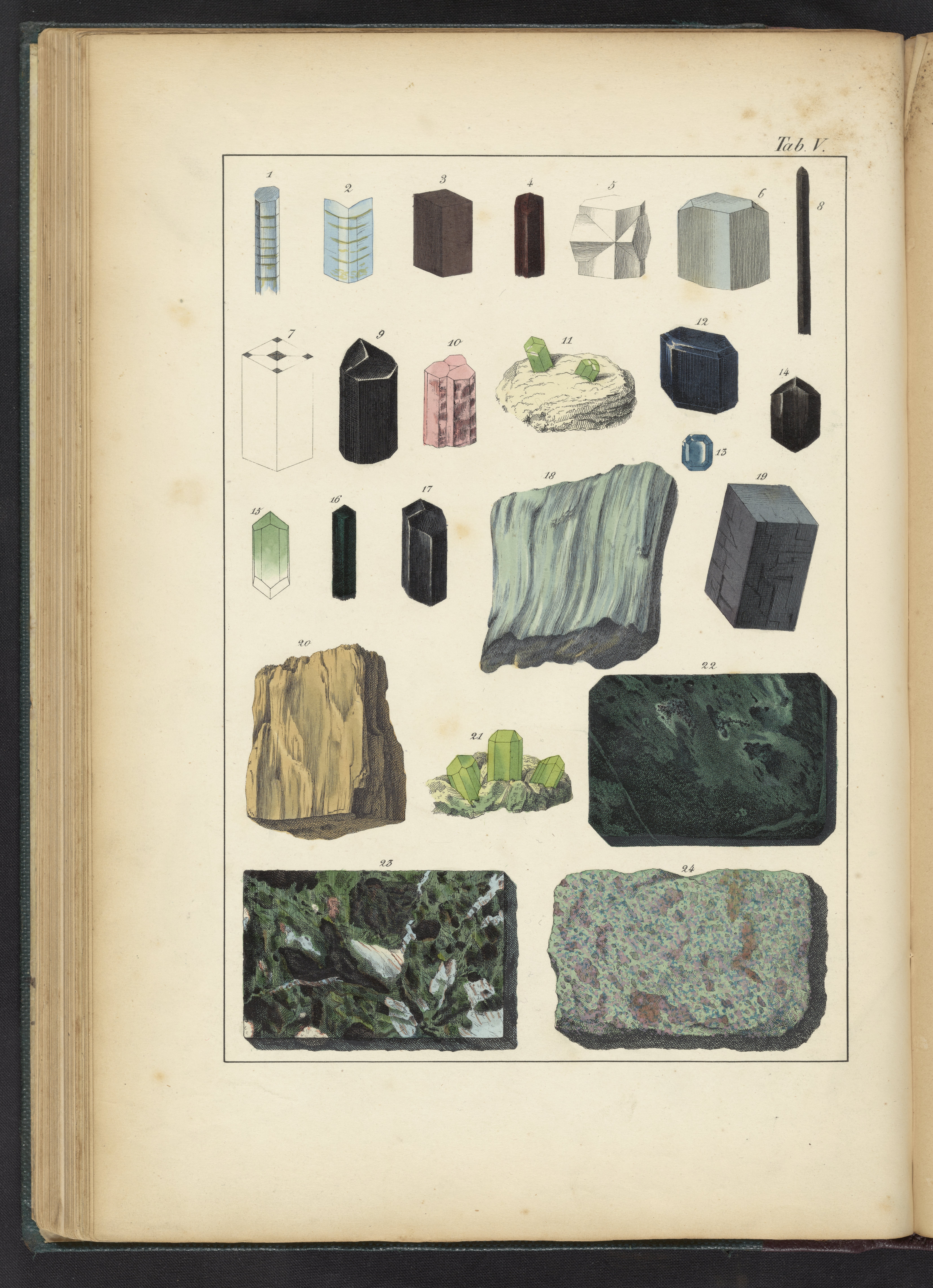 Plate V: Kyanite, Disthene, Staurolite, Andalusite, Tourmaline, Dichorite, Peliom, Augite, Hornblende, Amphibole, Hypersthene, Mountain Wood, Serpentine, Ophite, Omphacite