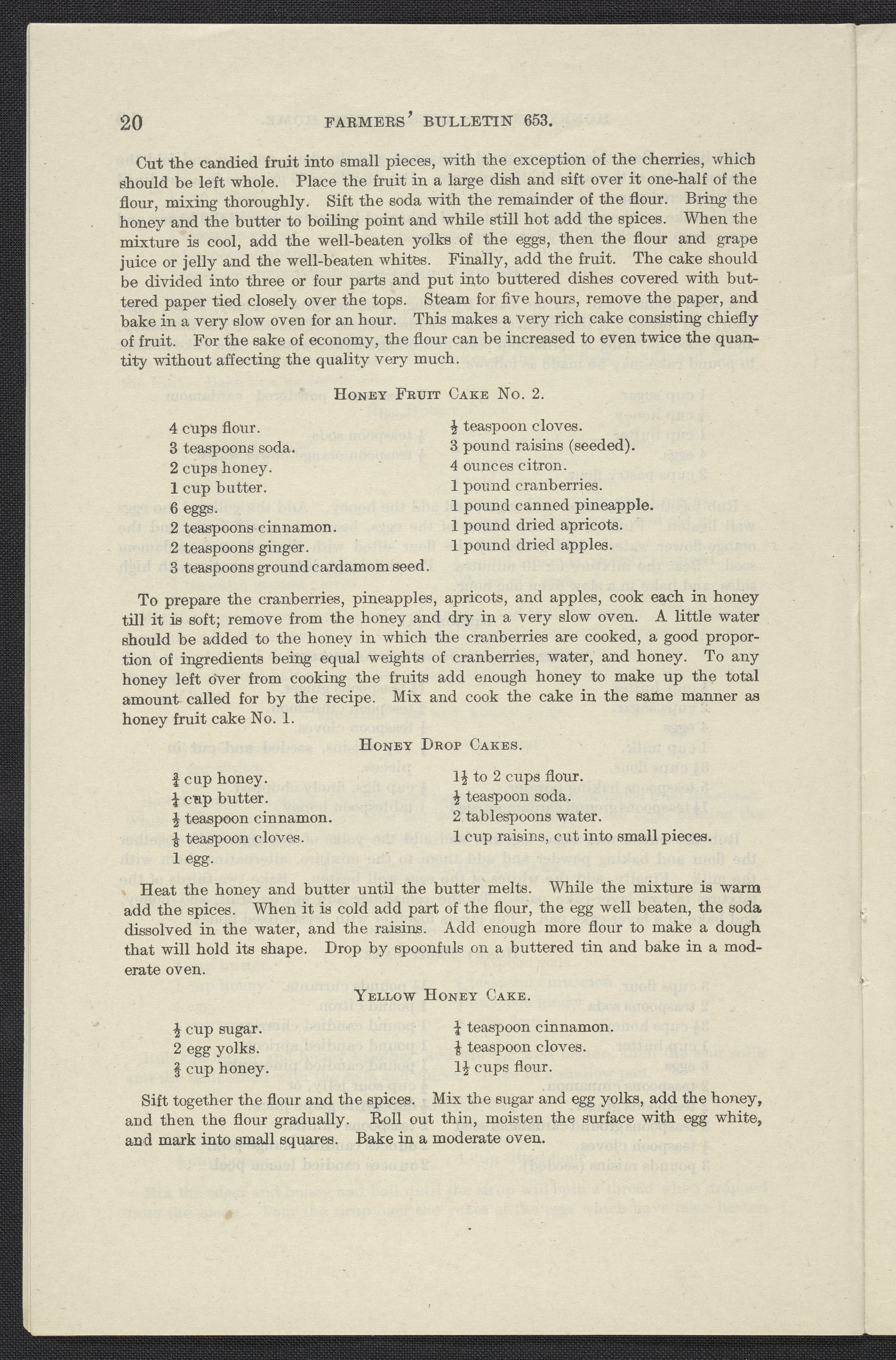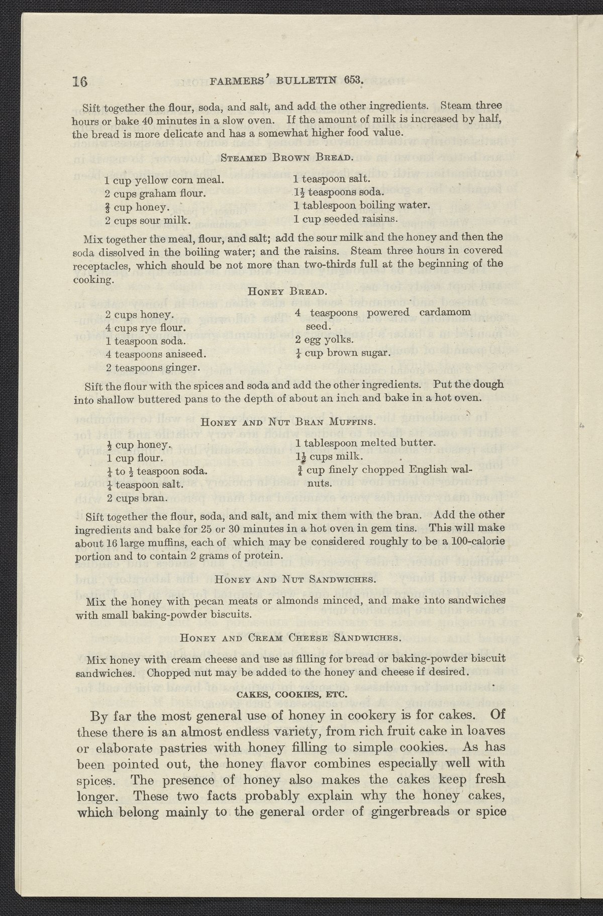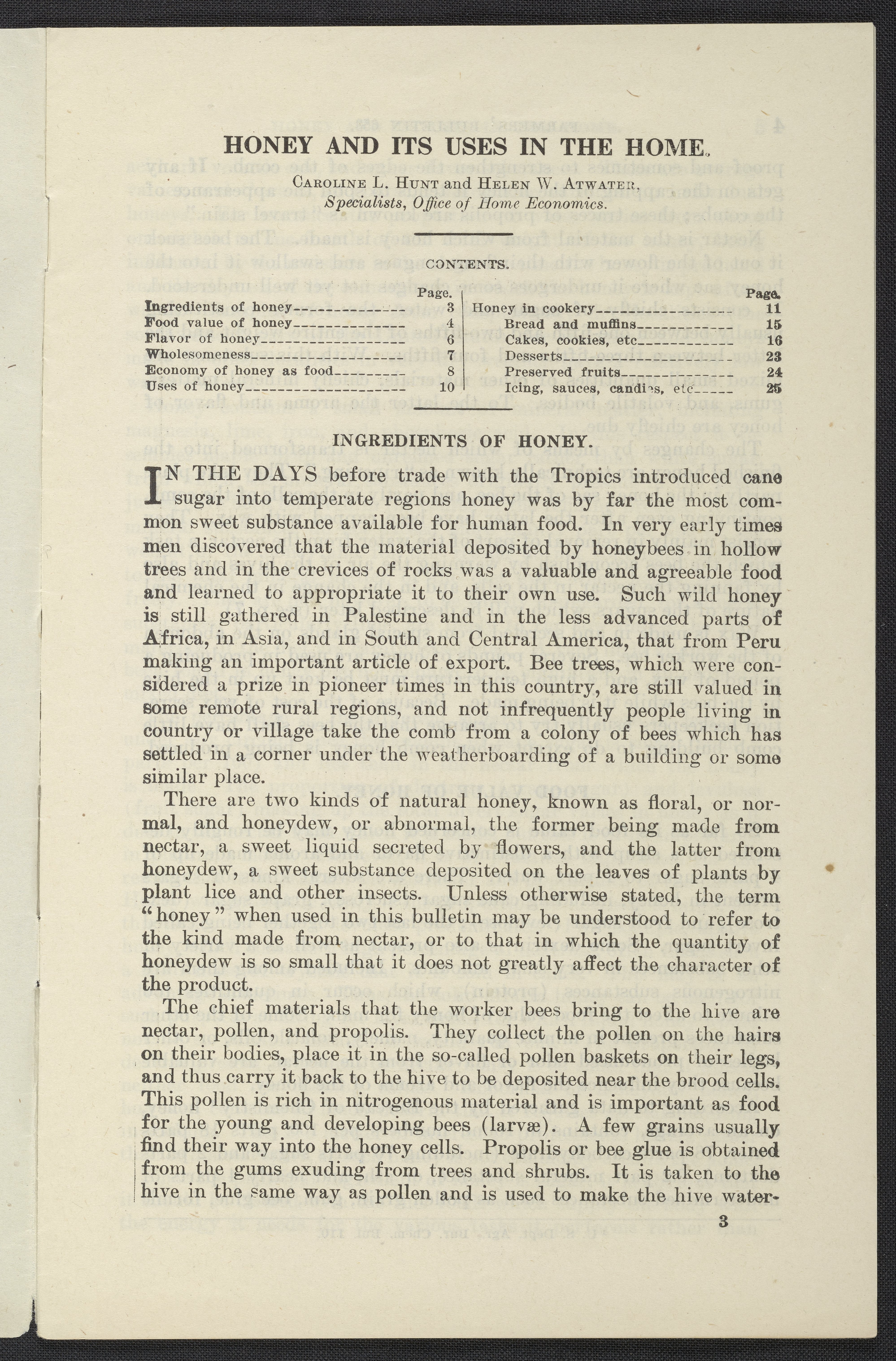 Small JPG1200 x 1853px — 376 KBLarge JPG2880 x 4447px — 2.4 MBFull-sized JPG3874 x 5982px — 4.1 MBOriginal fileTIFF — 3874 x 5982px — 66.4 MBInformational pamphlet on honey includes a description of how honey is produced, its value as a food, the flavor of honey, its health benefits, its economy, household uses, and how it can be used in cooking. Contains recipes for bread, muffins, cakes, cookies, desserts, preserved fruits, icing, sauces and candies.