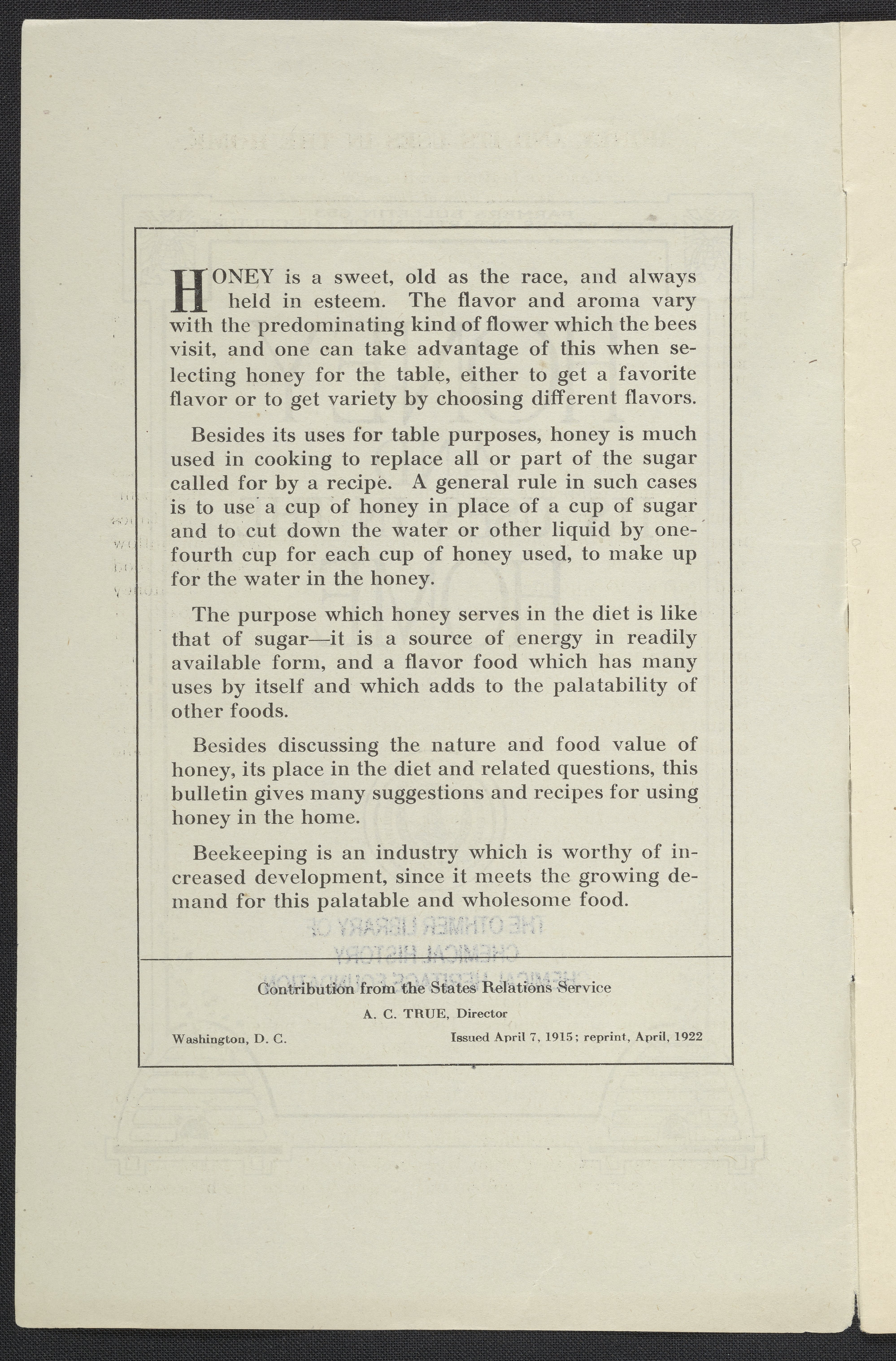 Hunt, Caroline Louisa, and Helen W Atwater. “Honey and Its Uses in the Home.” Washington (D.C.): United States. Department of Agriculture, 1915. https://digital.sciencehistory.org/works/xzefbz5.