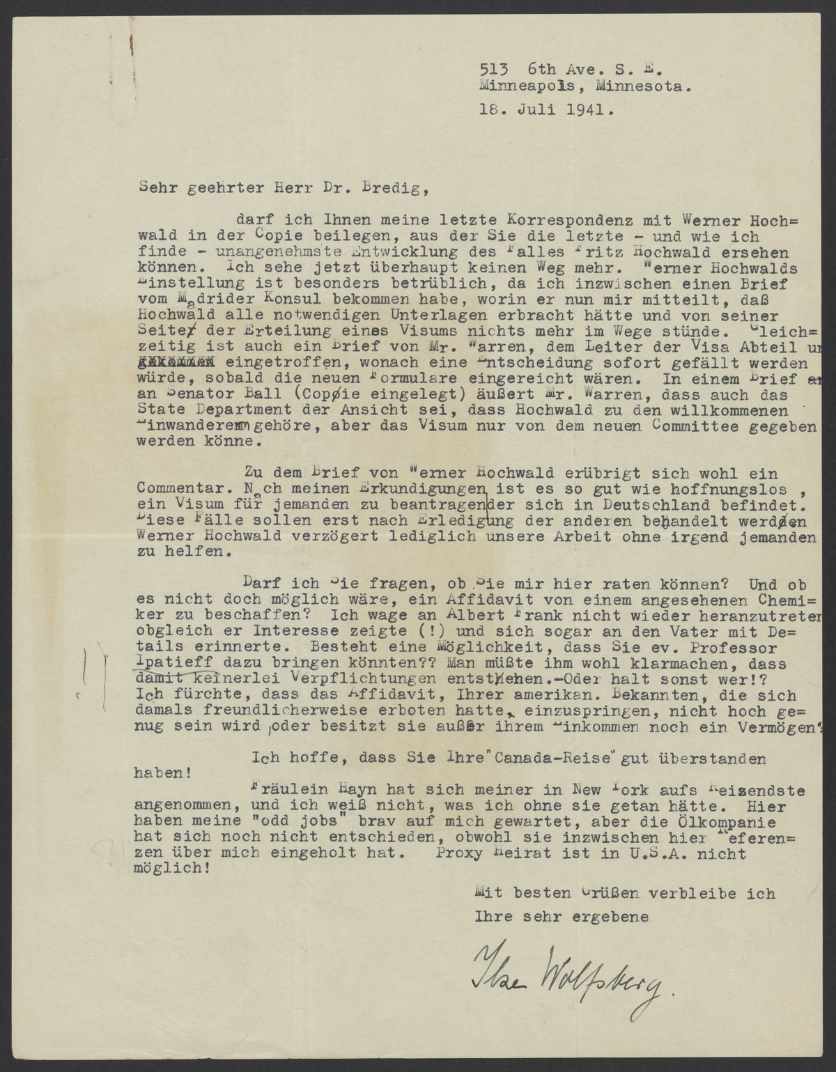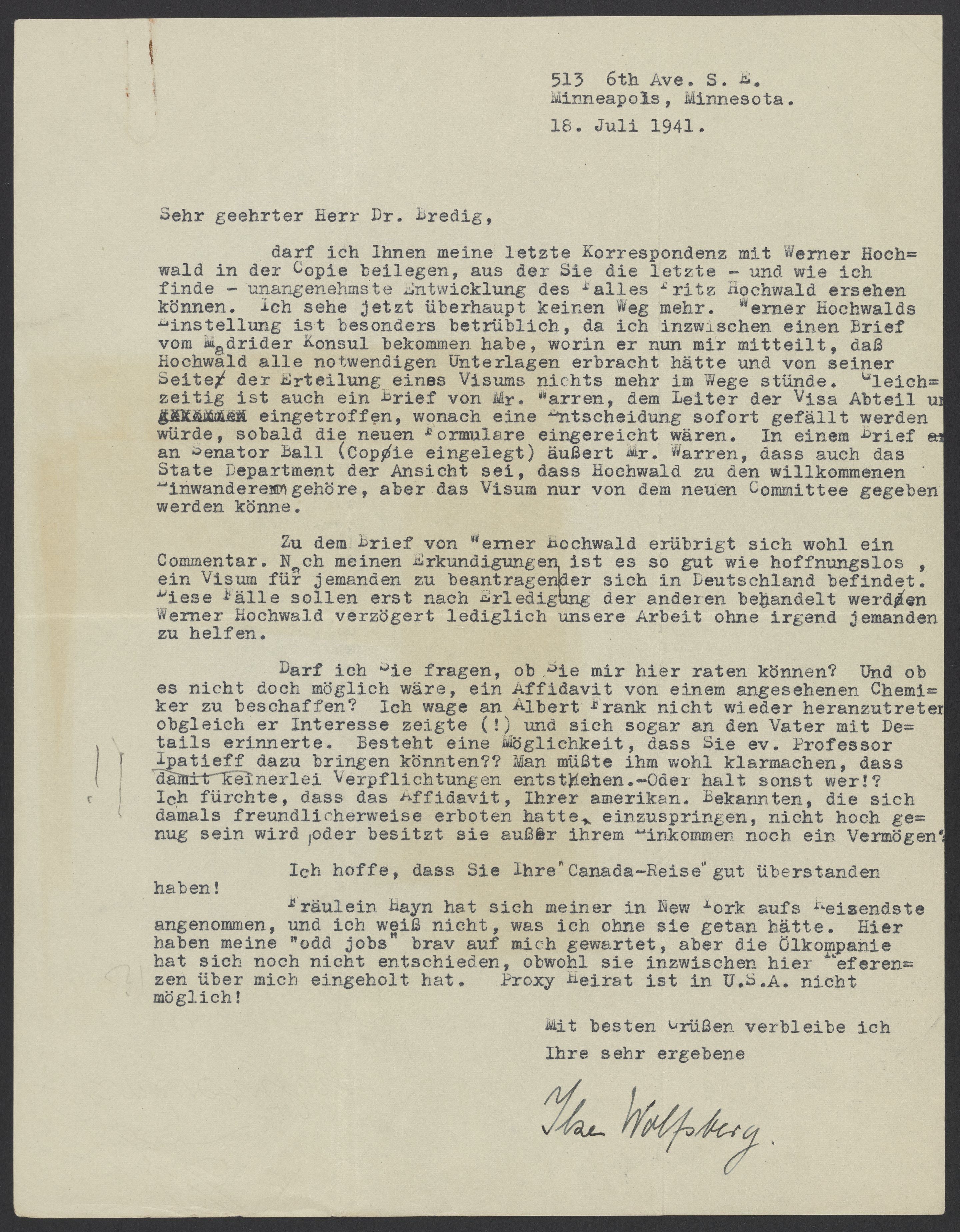 Letter from Ilse Wolfsberg to Max Bredig, July 18, 1941