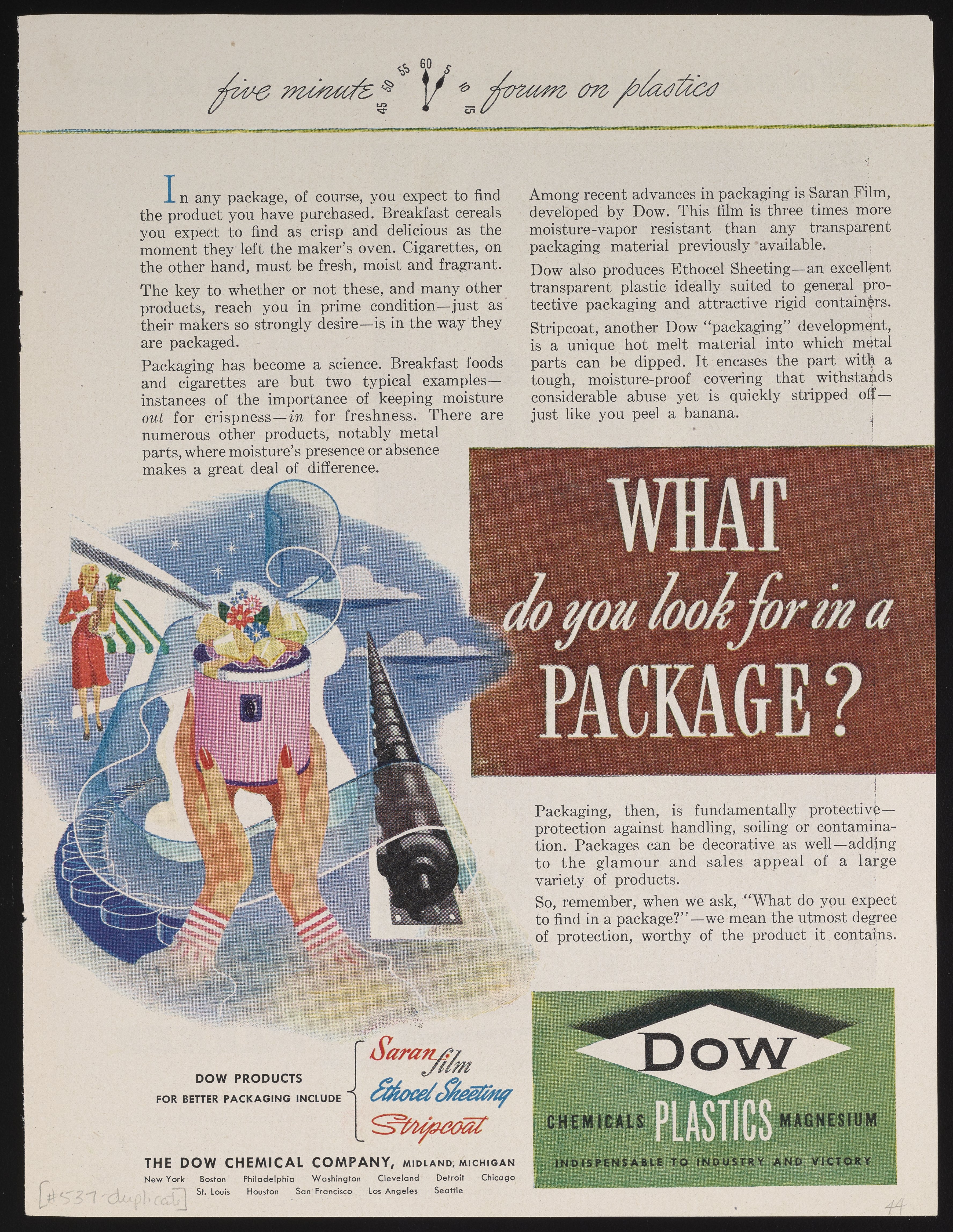 Dow Chemical Company. “What Do You Look For in a Package?,” 1944. Advertisements from the Dow Chemical Historical Collection, Box 9. Science History Institute. Philadelphia. https://digital.sciencehistory.org/works/y4oi1mq.