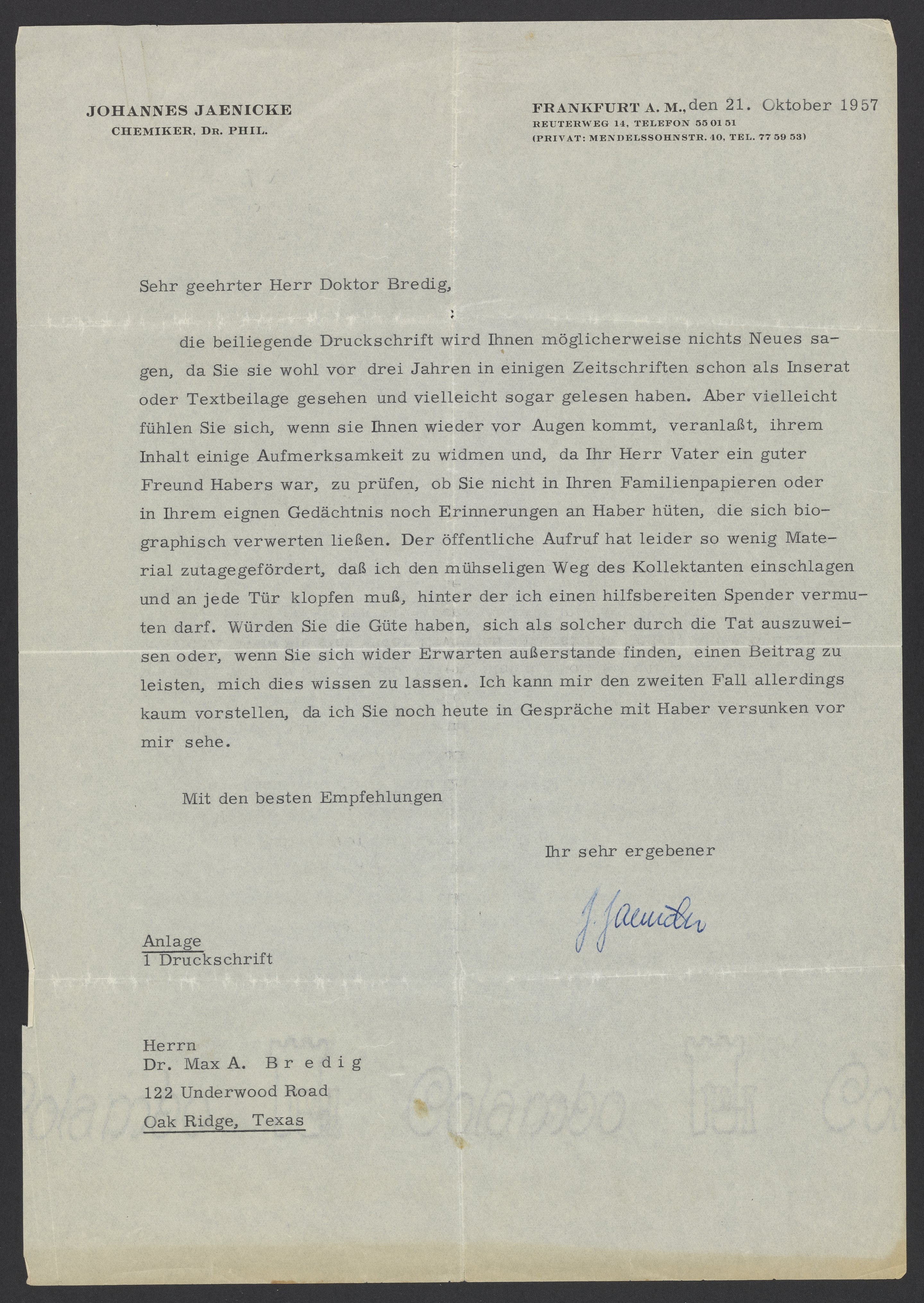 Letter from Johannes Jaenicke to Max Bredig, October 21, 1957