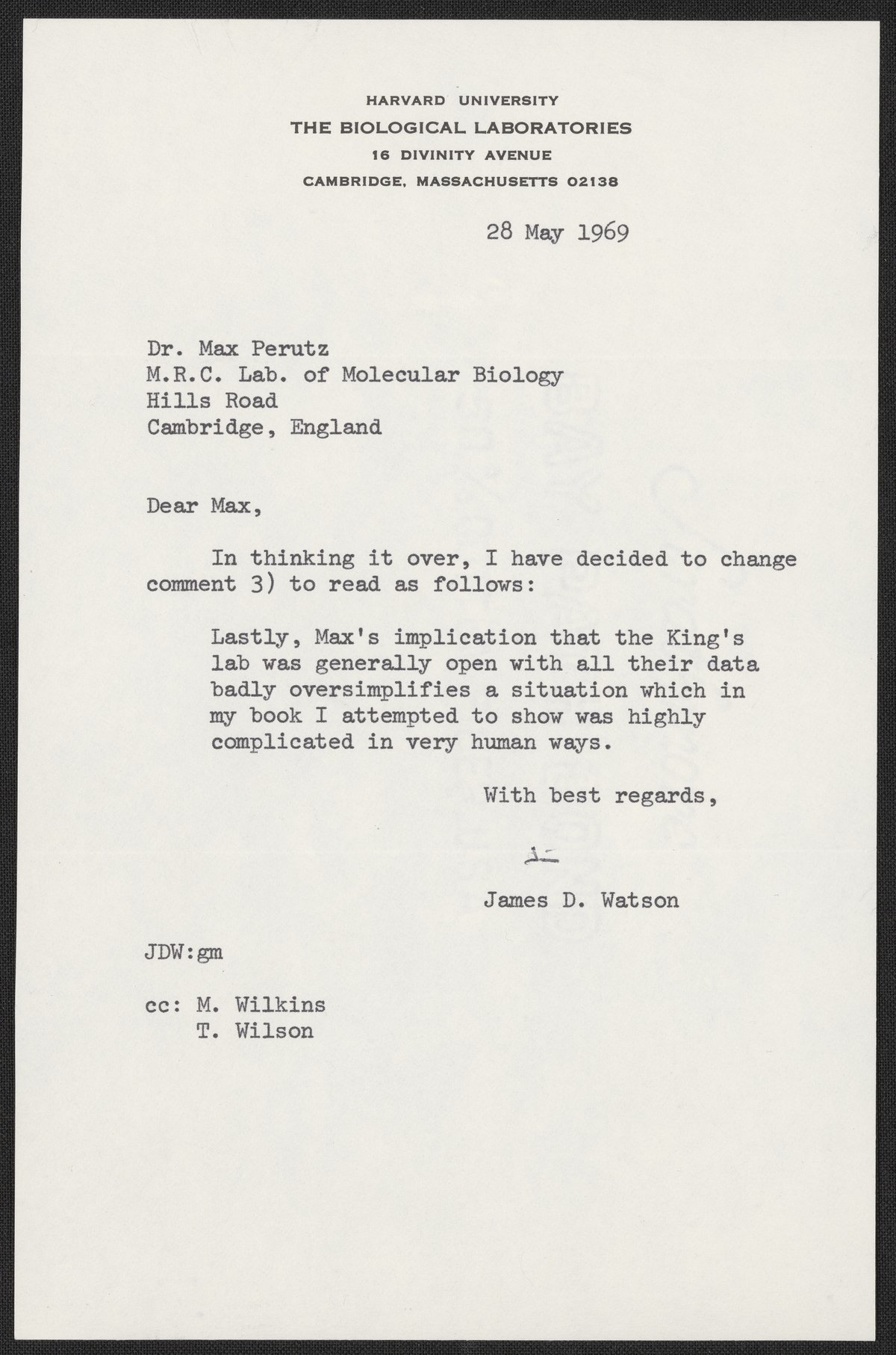 Letter from James D. Watson to Max Perutz, May 28, 1969