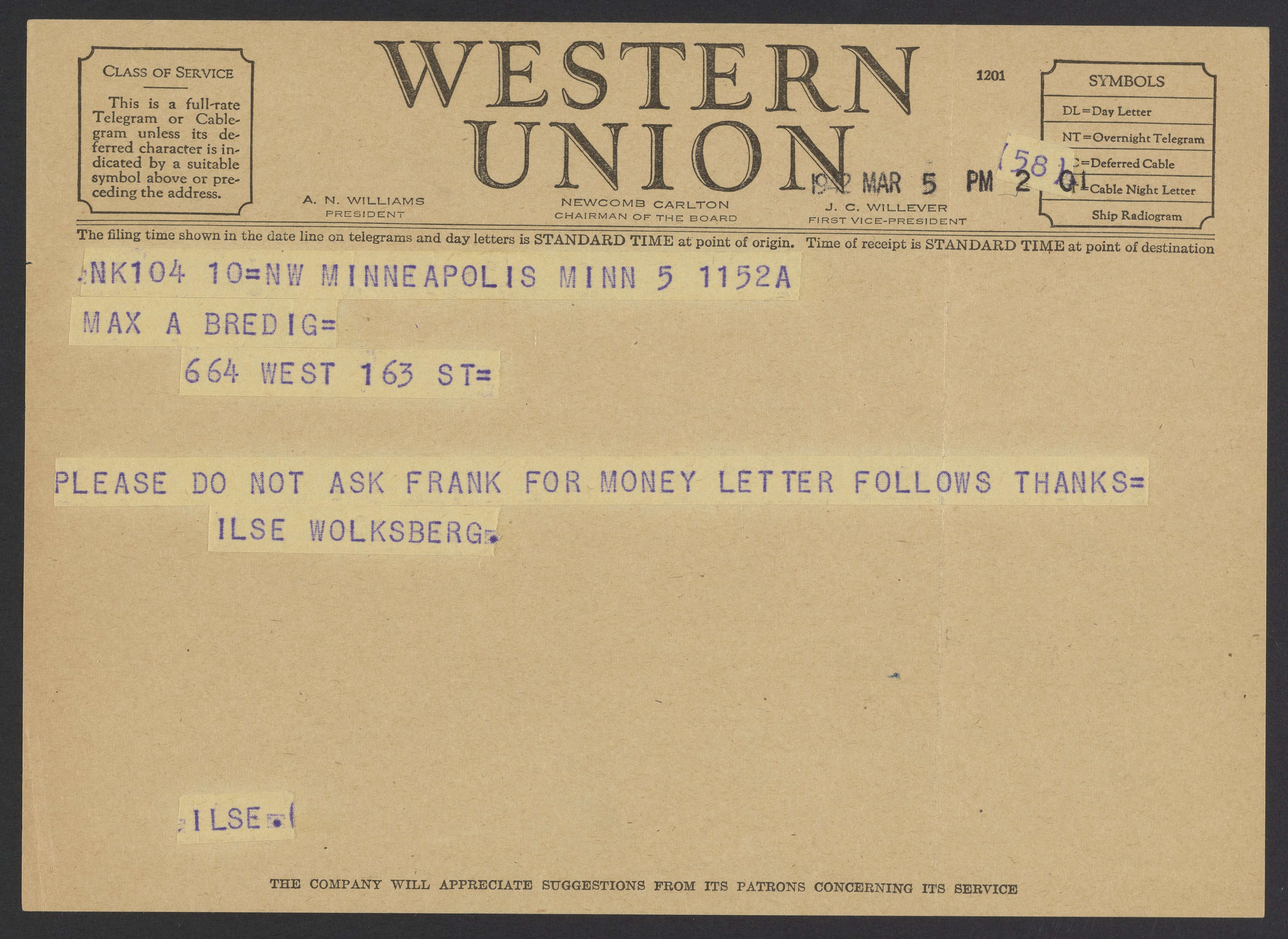 Telegram from Ilse Wolfsberg to Max Bredig, March 5, 1942