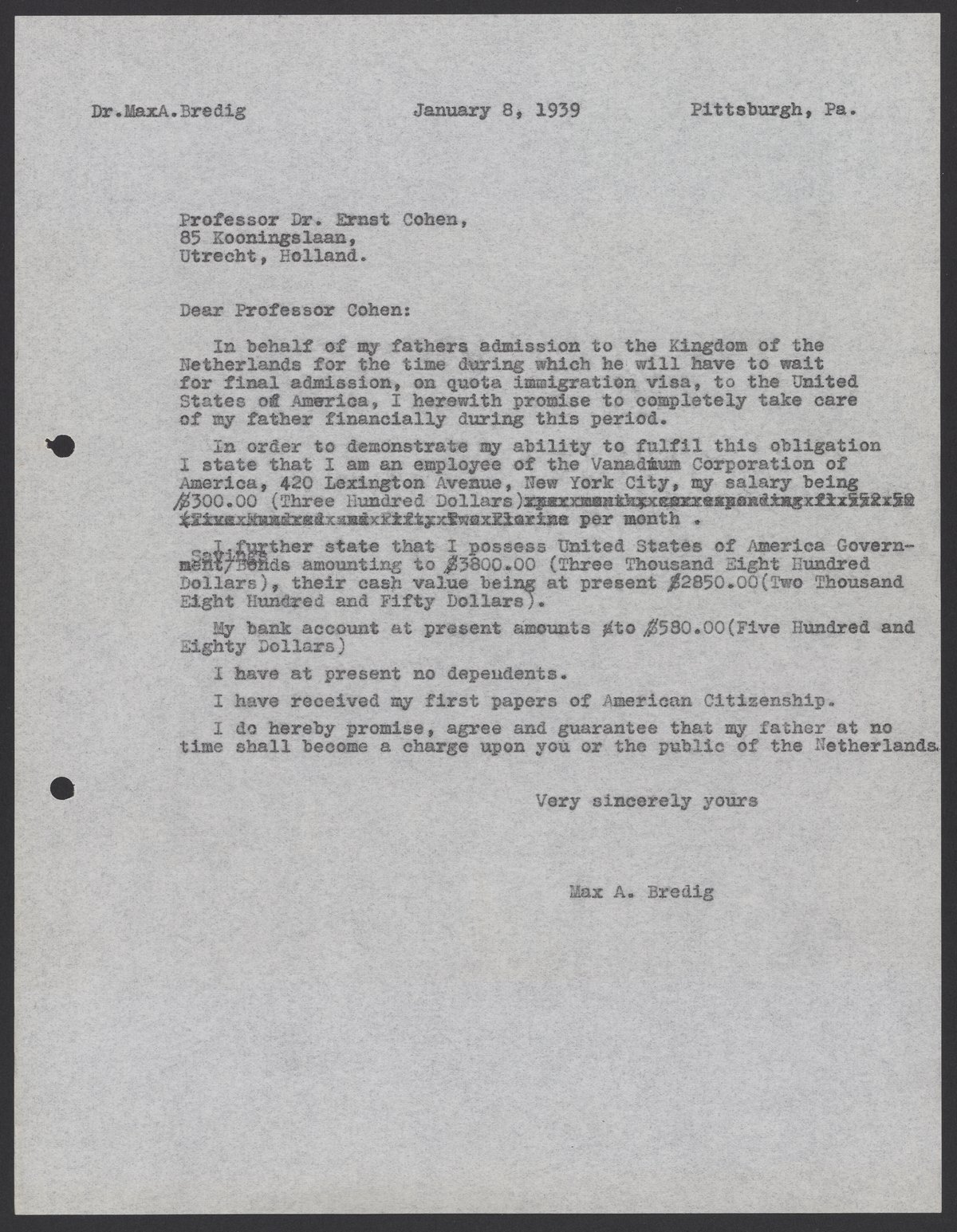 Letter from Max Bredig to Ernst Cohen, January, 1939