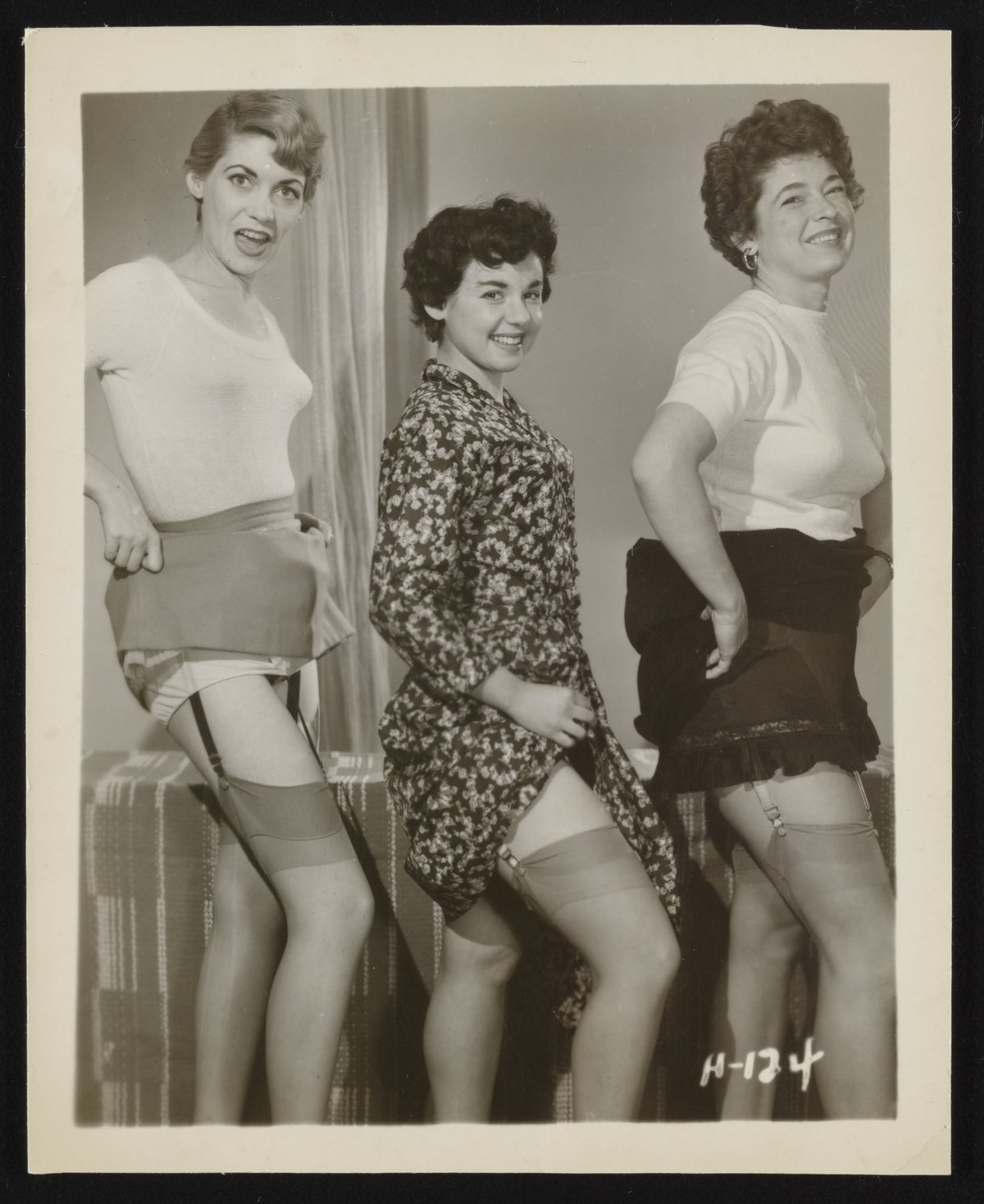 Black and white silver gelatin print photograph of three unknown women modeling their nylon stockings.