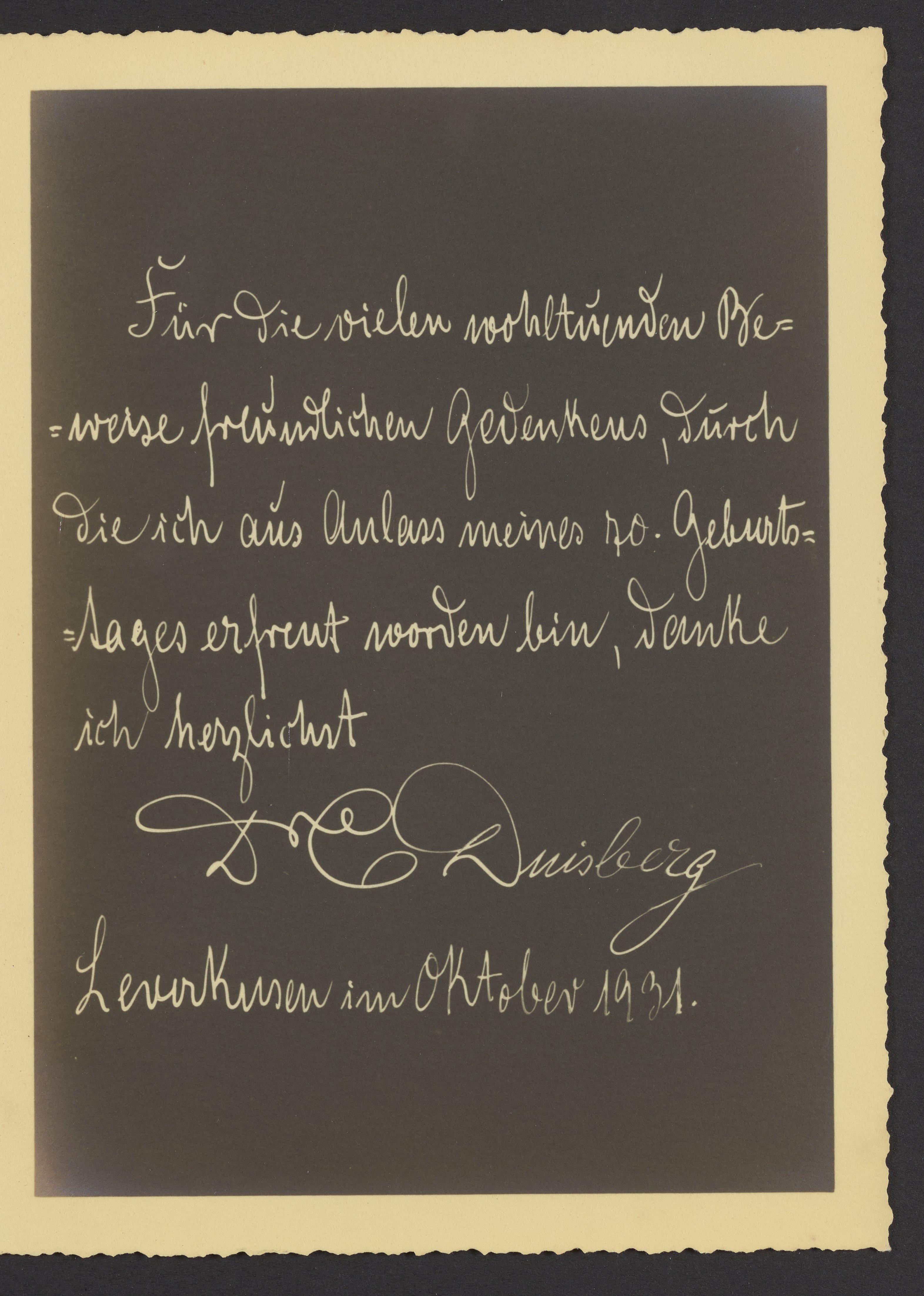 Thank you card from Carl Duisberg, October 1931